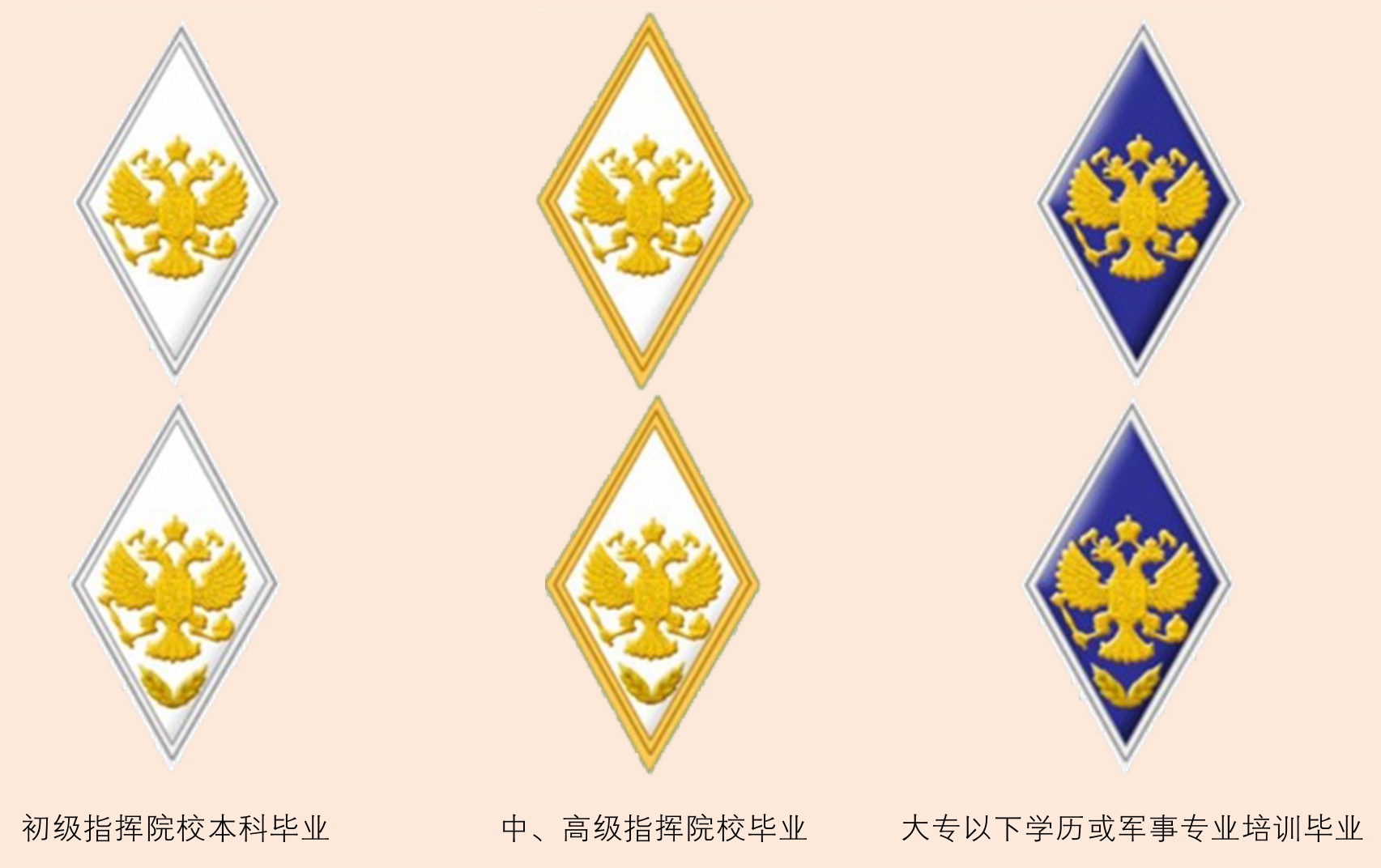 军事院校毕业生徽章,也称学历章。俄联邦军校的毕业生徽章为菱形徽章,上面铭刻着俄罗斯国防部的标识。对于优等毕业生的毕业生徽章,会在下方加缀月桂枝标识(图23)。