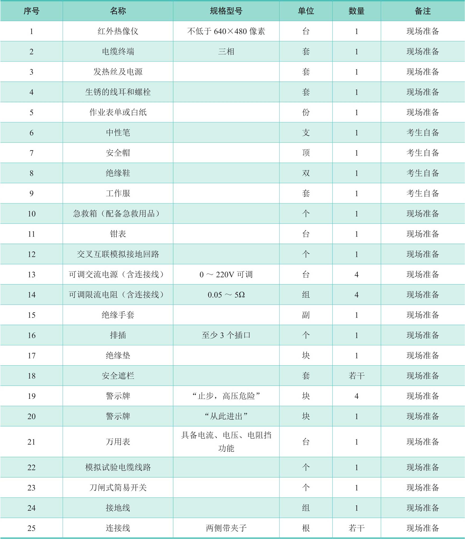 电缆综合实训场。必备4个工位,有可以多角度进行拍摄作业的室内或室外场地。每个工位具备三相电缆终端,每个工位利用发热丝模拟常见的异常发热点,或有部分生锈的线耳或螺丝。现场工作间距不小于3m,场地清洁,无干扰。