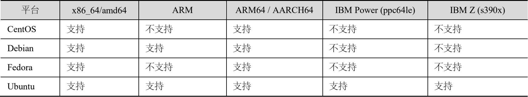 适合安装Docker CE的服务器操作系统是Linux,不同的发行版对硬件平台架构有要求,具体说明见表1-2。