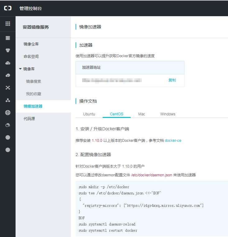 (2)成功登录之后打开镜像仓库管理控制台,单击“容器镜像服务”节点下面的“镜像加速器”,出现图1-8所示的界面,提供配置向导,自动生成一个加速器地址。