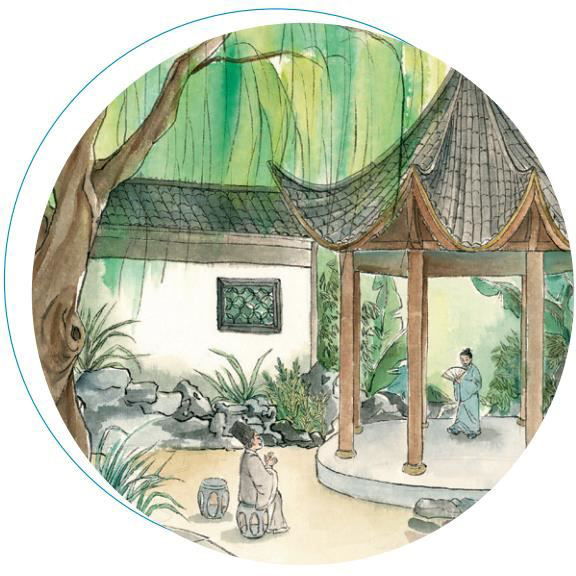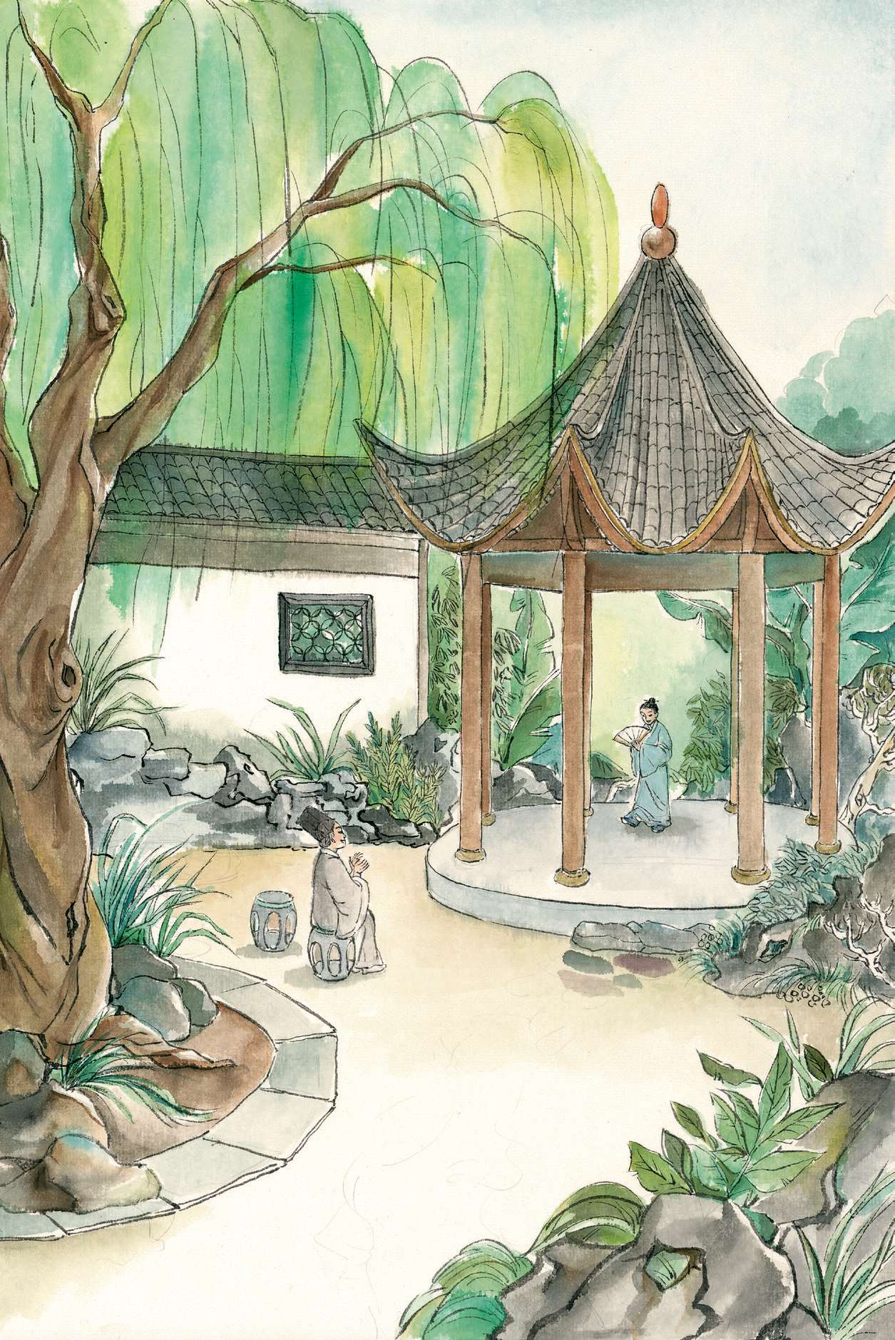 微风拂柳,轻轻摇动的柳叶后面,有两个十五六岁的少年。他们俩一个站在八角凉亭里,身穿一件簇新的滚着金边的云素绸衣裳,用一枚碧绿的玉簪束着头发,刚才那戏就是他唱的;另一个少年坐在凉亭外面的石凳上,穿一件干净素雅的灰白直裰,头戴方巾,手中打着节拍,认真听戏。