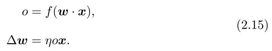 第二种学习规则是Hebb学习。1949年,心理学家Donald Olding Hebb提出了关于神经网络学习机理的“突触修正”假设。该假设指出,当神经元的突触前膜电位与后膜电位同时为正时,突触传导增强;当前膜电位与后膜电位正负相反时,突触传导减弱。根据该假设定义的权值调整方法,称为Hebb学习规则。Hebb学习的权值调整量Δ w 与输入 x 和输出 o 的乘积成比例,输出 o 可以根据输入 x 、参数 w ,以及函数 f 来获得: