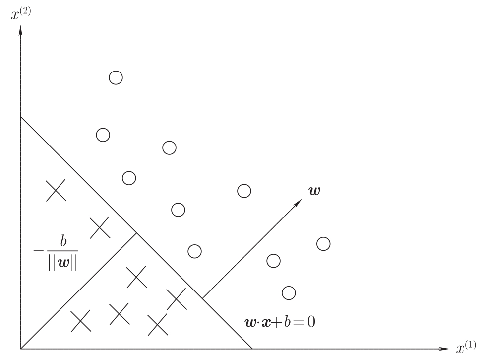 感知机模型的几何解释如图2.16所示。线性方程 w · x + b =0对应于特征空间ℝ n 中的一个超平面 S ,其中 w 是超平面的法向量, b 是超平面的截距,这个超平面将特征空间划分为两个部分,位于两部分的点(特征向量)分别被分为正、负两类。因此,超平面 S 被称为分离超平面。