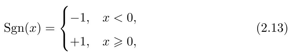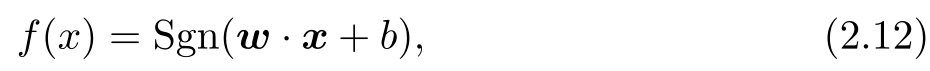 其中, w b 为感知机模型参数, w ∈ℝ n 叫作权值或权值向量, b ∈ℝ叫作偏置, w · x 表示两者的内积。Sgn是符号函数,即: