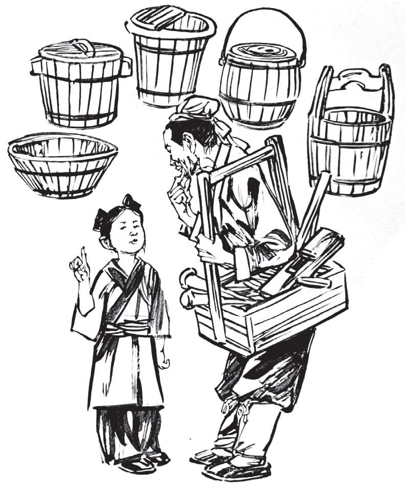 张师傅一听真是丈二和尚摸不着头脑,这些都是什么桶?幸好他还算机灵,连忙说:“有一件工具落在家里了,我去取回来再做。”张师傅回到家把事情经过一五一十地告诉了九斤姑娘,九斤姑娘“扑哧”一笑说道:“阿爹,天亮桶就是洗面桶,午时桶就是老饭桶,黄昏要用洗脚桶,半夜三更用马桶,至于奇怪桶,就是打水的吊水桶啊!”张师傅一听直拍大腿:“可不是嘛!”他高兴地跳了起来,“不愧是我们家聪明伶俐的阿囡!”