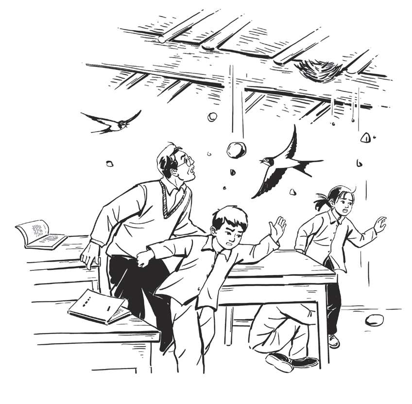 前边的同学们纷纷向外奔逃,后边来不及跑出去的就钻到了课桌下面。刘老歪离门最近,但他没有立马跑出去,而是镇定地指挥同学们逃离和自救。