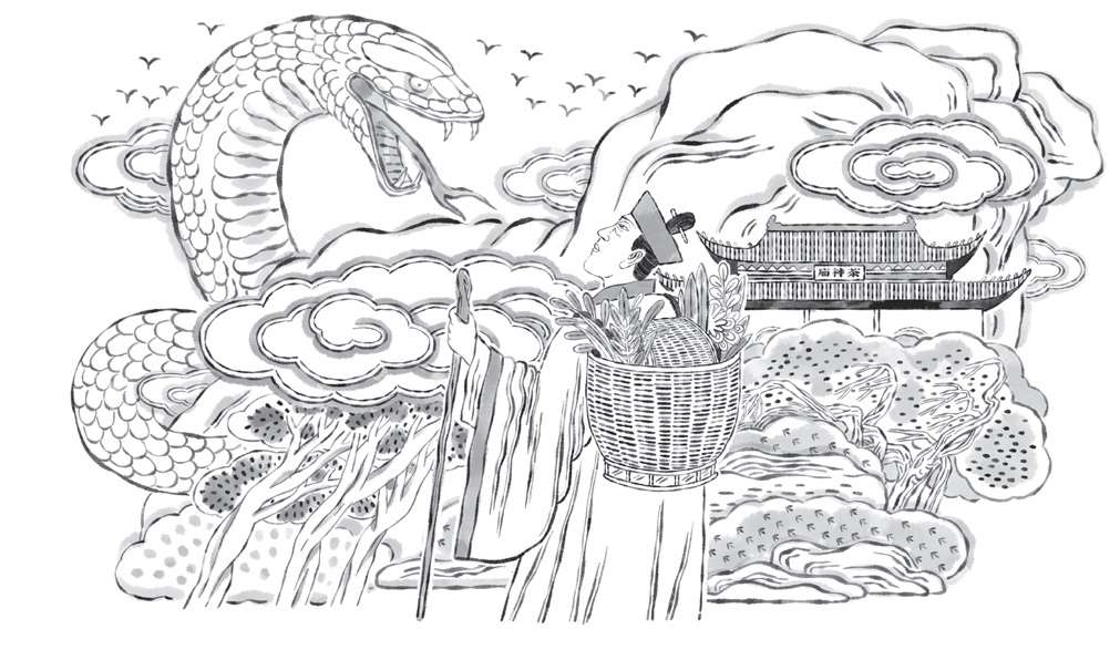 一天,村里来了一位气度不凡的道长,他听说这玉山上长了许多珍稀草药,便要找个村民带他上山采药。大家把山上蛇妖吃人的事儿告诉了他,有好心的村民劝他:“道长,这么多人上去,没一个能下来的。草药是能换点钱,可是命最要紧。”道长听了哈哈一笑,说:“黑蛇怪有啥可怕的?贫道这就上山为民除害,你们可有愿意前头带路的?”村里的小伙子见他不听劝,气呼呼地吼了他几句:“要去啊,你自己去,不要害别人,你在山上喊救命,我们听不到的。”