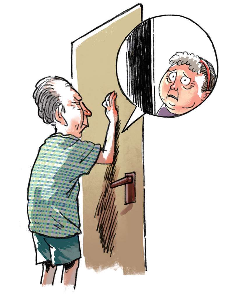 爷爷很健忘,他外出忘带钥匙,半夜回来时,便用力敲门。奶奶被吵醒了,隔着门问:“你找谁?我家老头子不在家!”