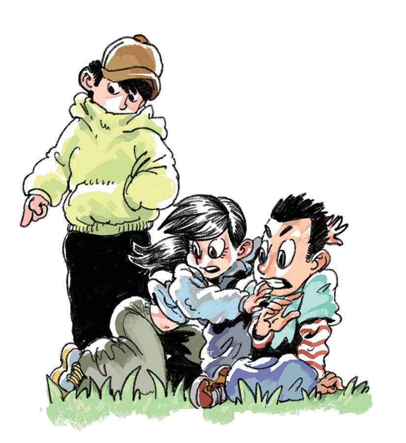 大军走到宿舍楼下,看到一男一女坐在草坪上,女孩害羞地低着头,男孩坐在旁边欲言又止。大军走过去,大叫道:“草里有蛇!”