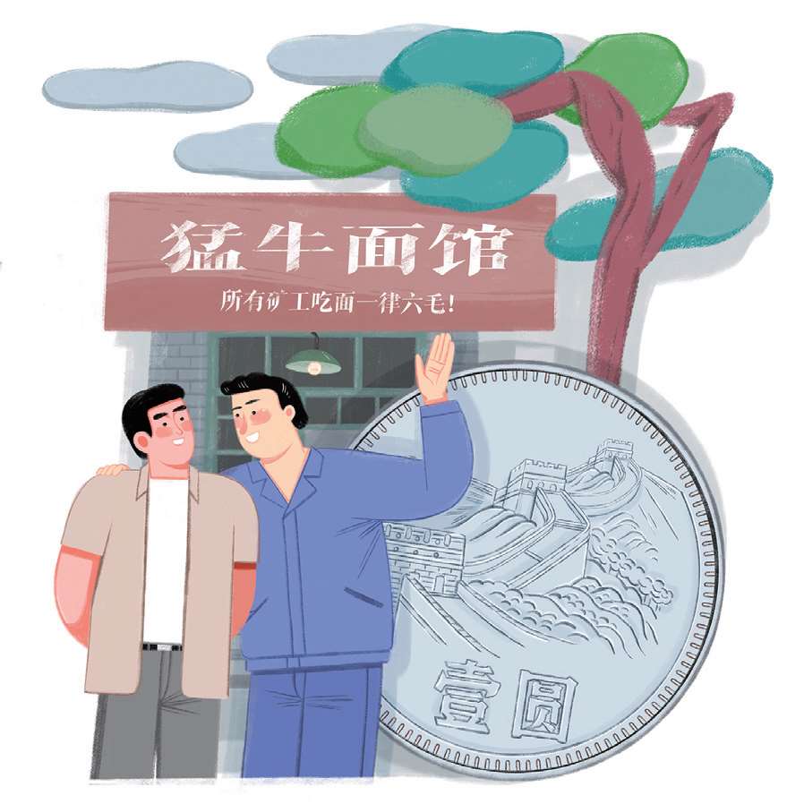 一个月后,走路还有些不利索的猛哥在工友们的簇拥下来到面馆,眯着眼睛看更换后的招牌:猛牛面馆。下面写着一行小字——矿工吃面,一律六毛!