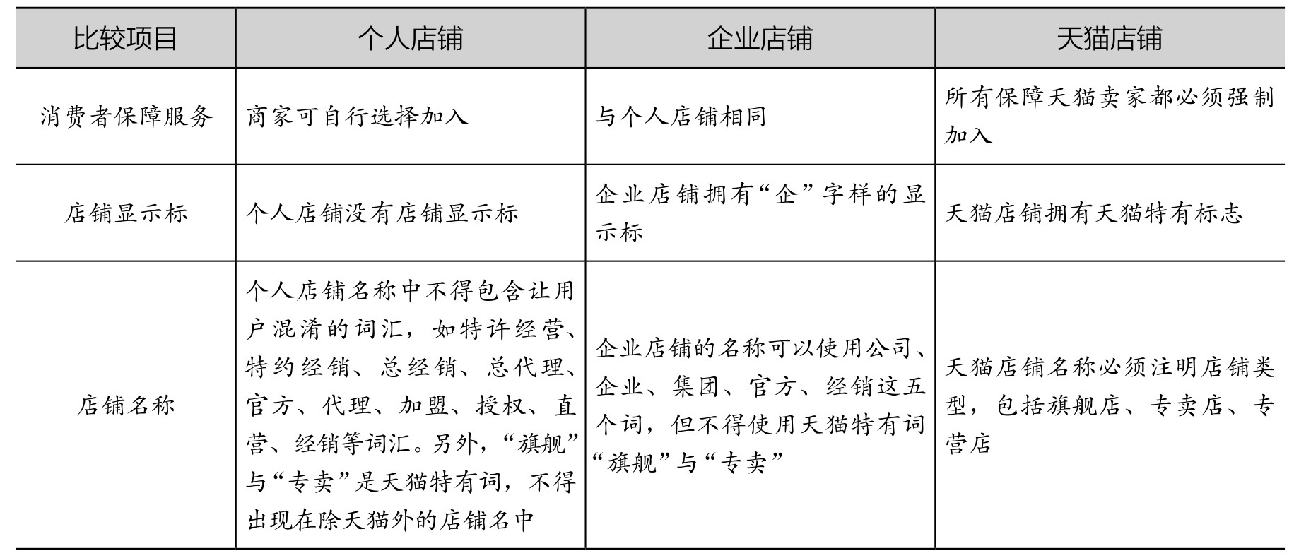除此之外,个人店铺、企业店铺和天猫店铺在店铺评分体系、消费者保障服务、店铺显示标、店铺名称等方面均有所不同,具体如表2-1所示。