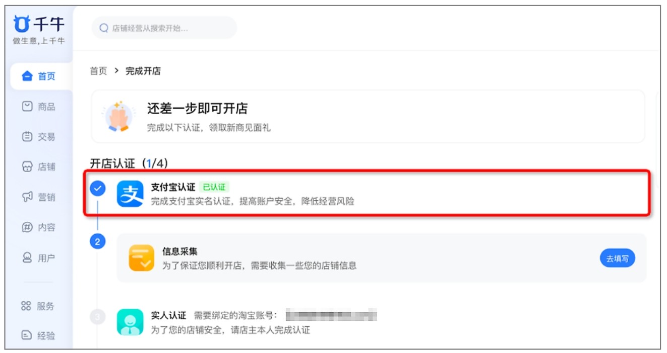 步骤5 系统跳转至“千牛卖家中心”页面,根据页面提示依次进行支付宝认证、信息采集、实人认证,并缴纳保证金,如图2-12所示。