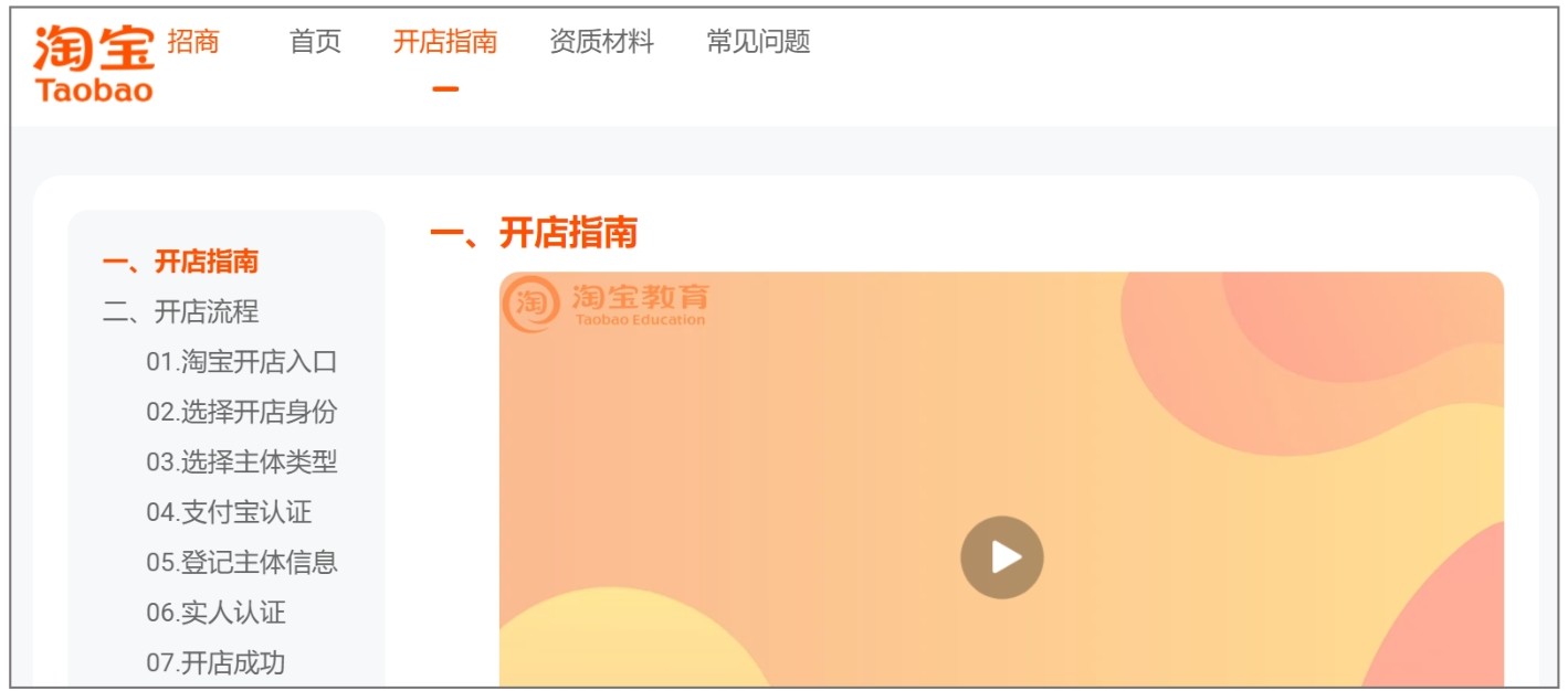 进入“开店指南”页面,商家即可通过视频或文字了解淘宝开店的详细流程,如图2-3所示。