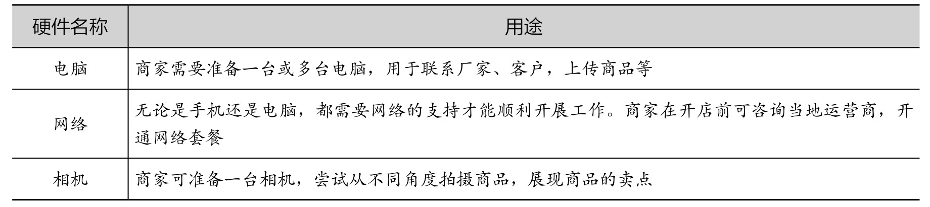 网上开店虽然投资少,但也需要卖家准备一些常用硬件设备,如电脑、网络、相机等,这些硬件设备的用途如表2-4所示。
