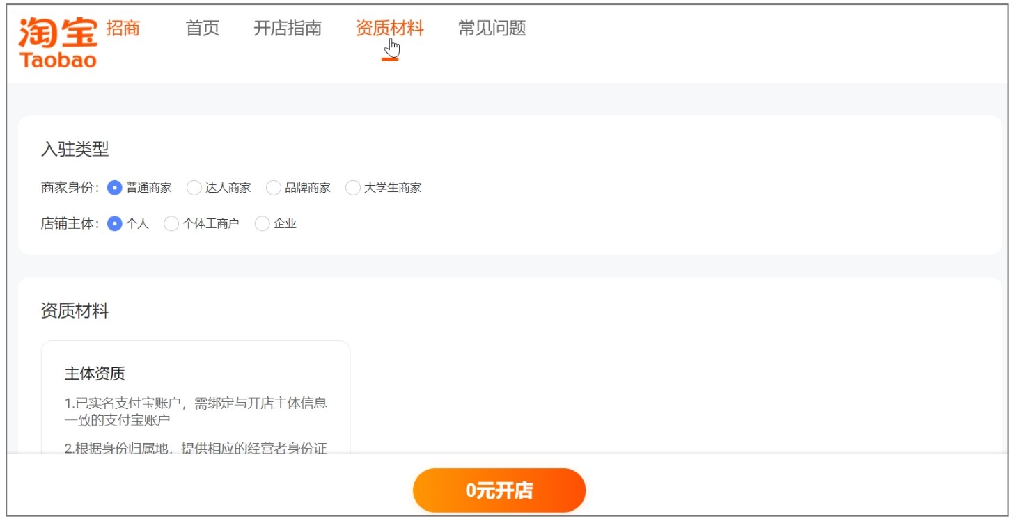商家在查看网店入驻流程后,可根据流程中所提及的步骤准备所需资料。在淘宝平台上开店,商家需要提前选择好自己的开店身份和店铺主体类型,并准备好相关的资质材料。