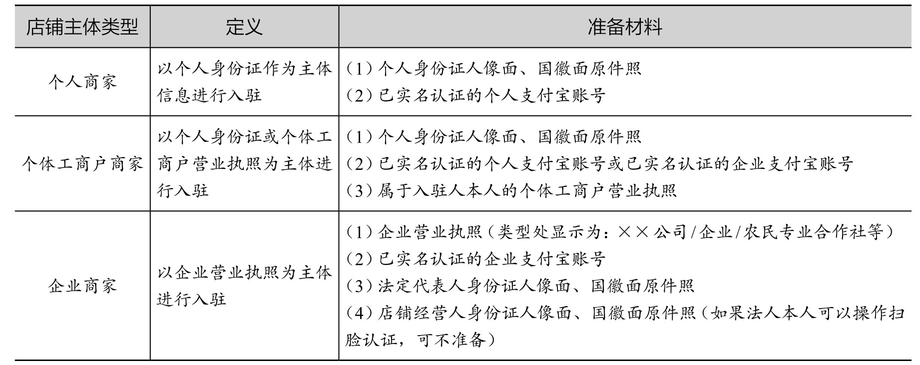 在淘宝平台上开店,商家需要根据不同的店铺主体类型和开店身份,提前准备好主体信息资质相关材料(必备)和商家身份认证相关材料(非必备),具体内容如表2-2和表2-3所示。