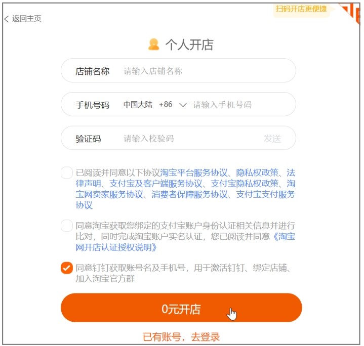 提示 若进入开店流程,但是没有淘宝账号,则可以选择短信入驻——填写手机号码,输入验证码之后会自动生成淘宝账号。若已经有淘宝账号,则可以直接选择密码登录。