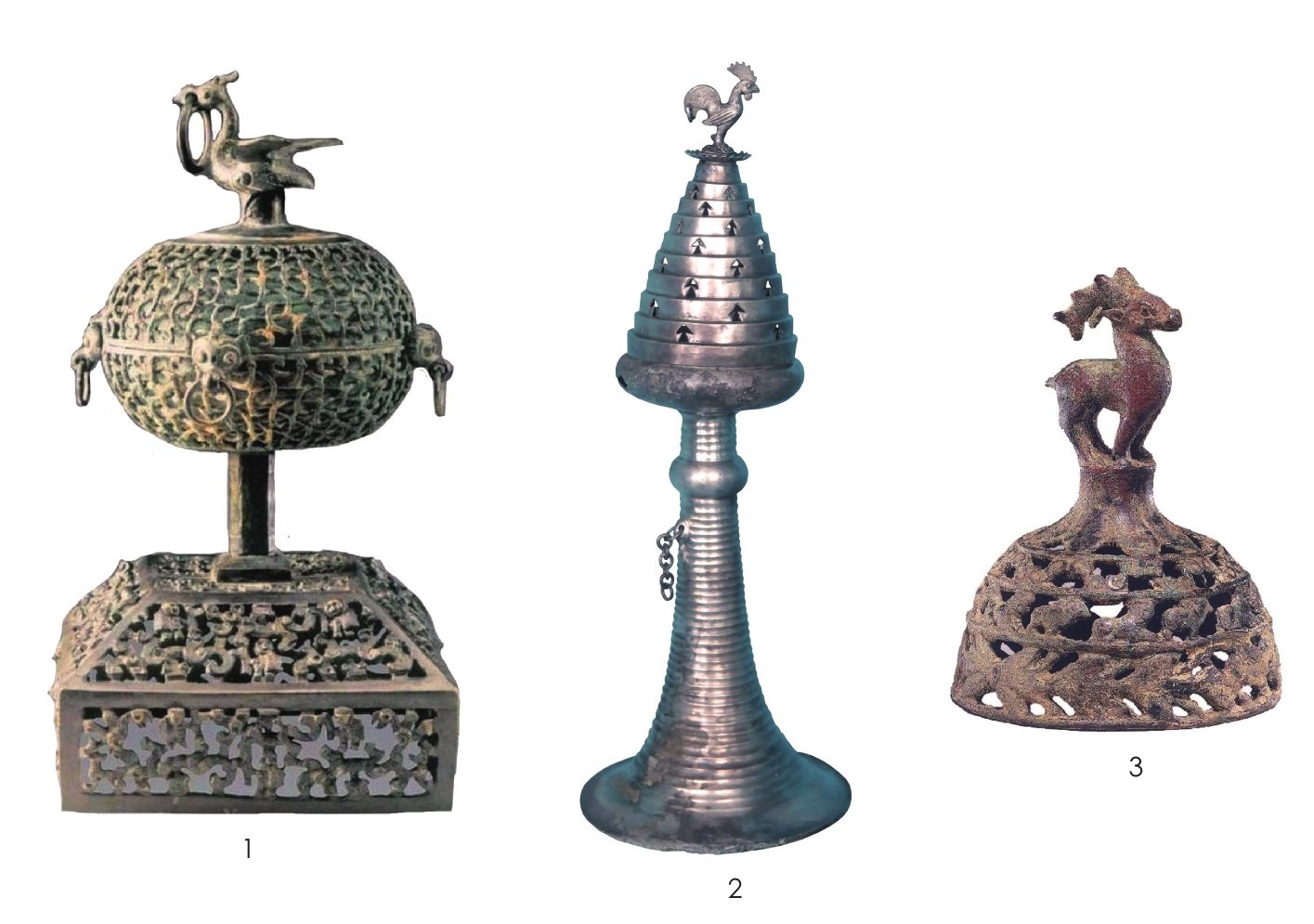1995年,陕西凤翔雍城遗址西部姚家岗宫殿遗址附近出土了一件战国时期凤鸟纹镂空熏香炉,由覆斗形底座、空心斜角方柱和带衔环凤鸟的椭球形炉体三部分组成(图十四:1)。覆斗形底座纹饰为一次铸成的镂空高浮雕图案,四个正立面纹饰相同,构图可分上下两层,每面有三只虎纹。高34厘米,底座边长18.5厘米,盖上有一立鸟,现藏凤翔区博物馆。土耳其安纳托利亚的吕底亚古墓发现过一件波斯风格的熏香炉(图十四:2),盖上也有一只立鸟,年代约在公元前6—前5世纪,现藏安卡拉市安纳托利亚文明博物馆。在香炉盖上塑造立鸟的习俗一直沿用到东汉,如保利艺术博物馆收藏的东汉老人柱凤钮盖博山炉上就塑有一只立鸟,东西方古代熏香炉造型艺术之间的联系是显而易见的。