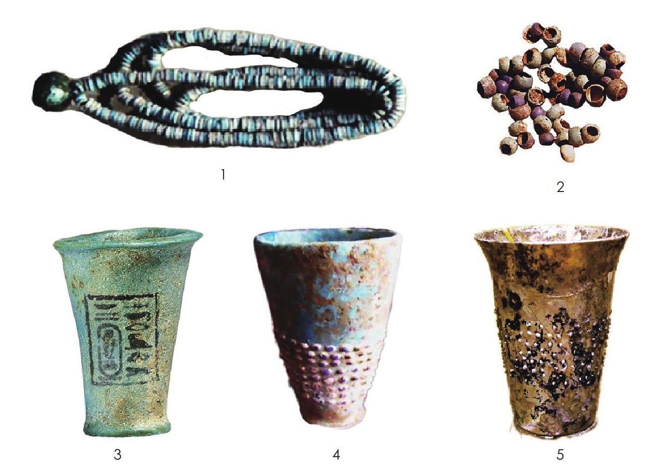 殊不知,马家塬战国墓出土蓝色料珠和斜壁杯的材质并非玻璃,而是公元前3500年古埃及人发明的一种类似玻璃的人工合成物质,主要成分为硅酸铜钙(CaCuSi 4 O 10 ),通称“费昂斯”(faience)或“埃及蓝”(Egyptian blue)。美国纽约大都会艺术博物馆藏有一件公元前7世纪埃及古墓出土埃及蓝料珠项链(图七:1)。除制作项链和护身符之外,古埃及人还用埃及蓝制作酒杯,如埃及新王朝和罗马时期费昂斯斜壁杯(图七:3、5)。此外,古埃及人还用费昂斯做陶器釉色和壁画颜料。古埃及人发明这种人工合成物质的初衷,是用来替代波斯的绿松石或阿富汗的青金石。这两种天然宝石依赖进口,在埃及早王朝乃至古王国时期埃及蓝的价格堪比黄金。埃及费昂斯工艺成熟、造价低廉,很快成为重要商品远销美索布达米亚、伊朗、努比亚乃至苏格兰。
