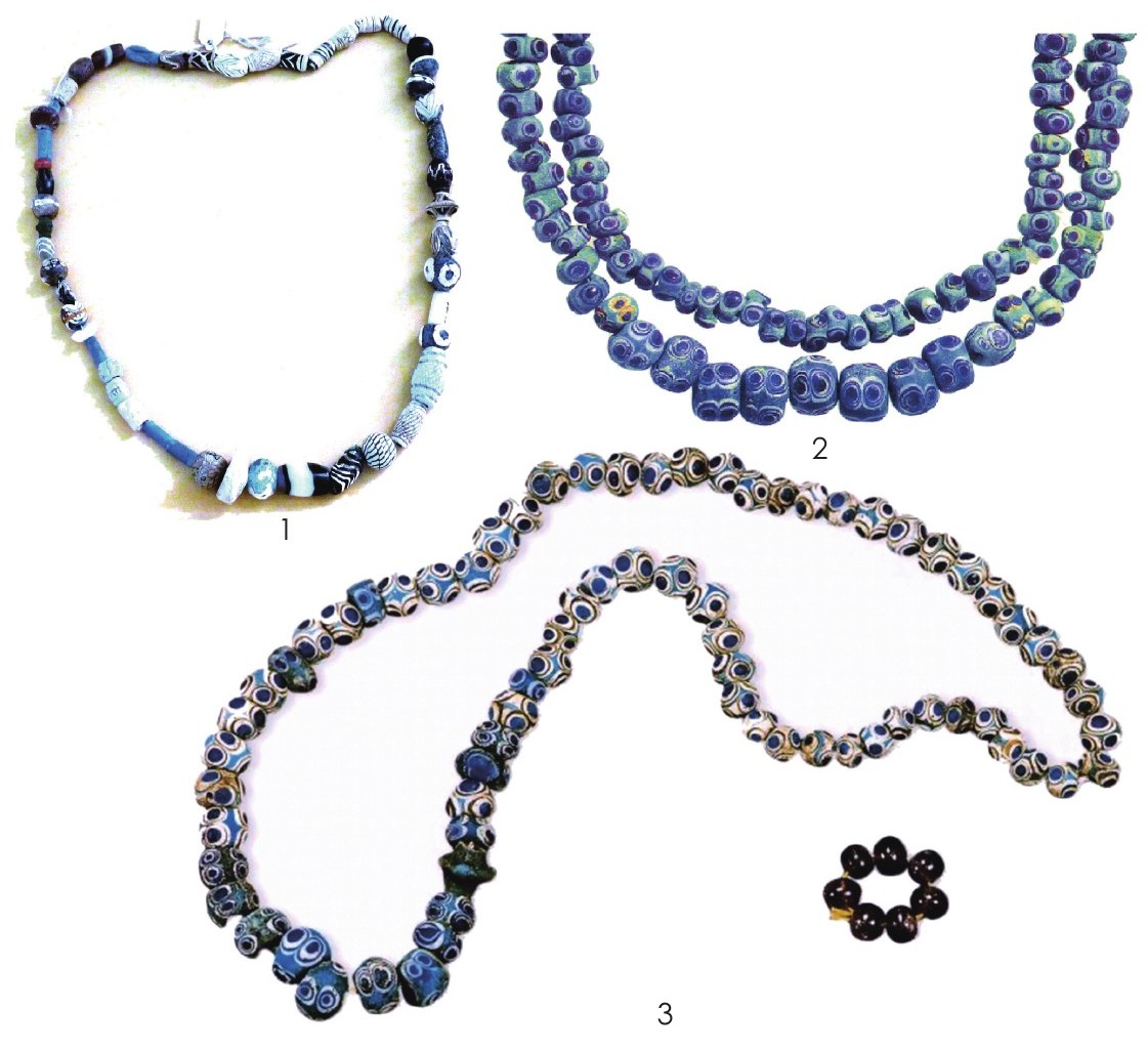 1978年,在湖北随县曾侯乙墓发掘出土了173颗蜻蜓眼式玻璃珠项链(图六:3),每颗玻璃珠直径约1厘米,在蓝色玻璃球上嵌有白色及棕色玻璃花纹。据化学成分检测,曾侯乙墓出土玻璃珠项链的化学成分十分接近新疆克孜尔古墓出土的玻璃成分,那么这件异国情调的玻璃珠项链是经过丝绸之路沙漠路线传来的波斯之物。