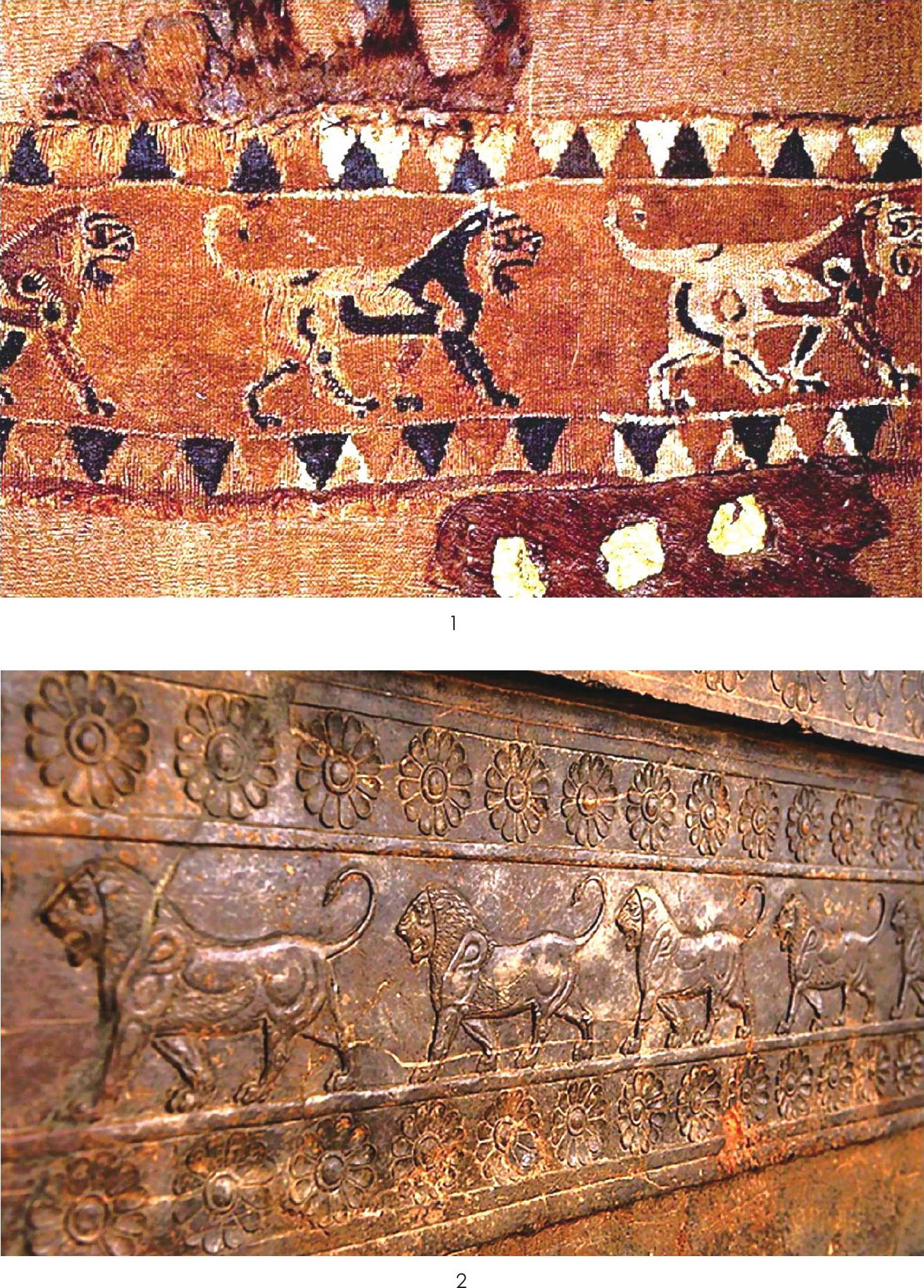 就在这个时期,古波斯艺术传入中亚草原斯基泰部落。20世纪50年代,苏联考古学家鲁金科在阿尔泰山巴泽雷克发掘了大批斯基泰古墓,出土了许多波斯风格的艺术品,其中一件波斯地毯绣有列狮图案(图十一:1),与伊朗国家考古博物馆藏古波斯王宫的列狮浮雕(图十一:2)如出一辙。