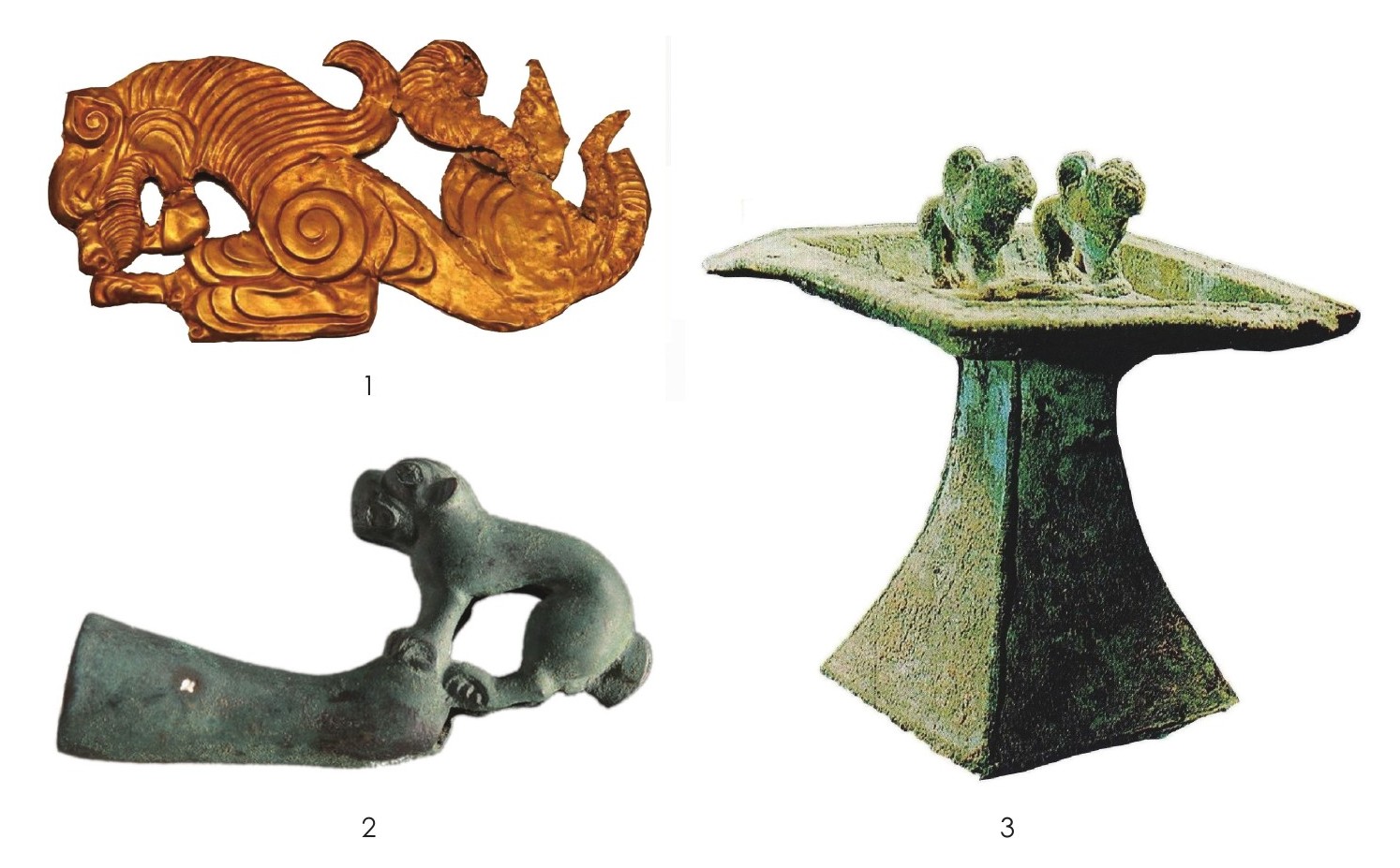 中国境内最早的狮子艺术品,是1977年在新疆乌鲁木齐市南山矿区阿拉沟战国墓发现的。这座斯基泰人木椁墓共出土动物纹金饰片凡40余件,轻薄如纸。其中一件为雄狮纹样(图十二:1),后蹄呈180°翻转,属于中亚草原公元前5—前3世纪流行典型的动物纹样。阿拉沟战国墓还出土了一件青铜承兽祭坛,祭坛上有一对带翼青铜狮子(图十二:3)。1962年,内蒙古准格尔旗速机沟征集到一件战国晚期狻猊竿头,通长9.5厘米、銎长10厘米,现藏内蒙古自治区博物馆。狻猊四足收拢立于圆筒形銎的一端。头微昂,张嘴,双目前视,短尾。后肢下蹲,形似准备向前猛扑状。腹体中空。銎上部稍细微弯,两侧有钉孔,用以固柲(图十二:2)。