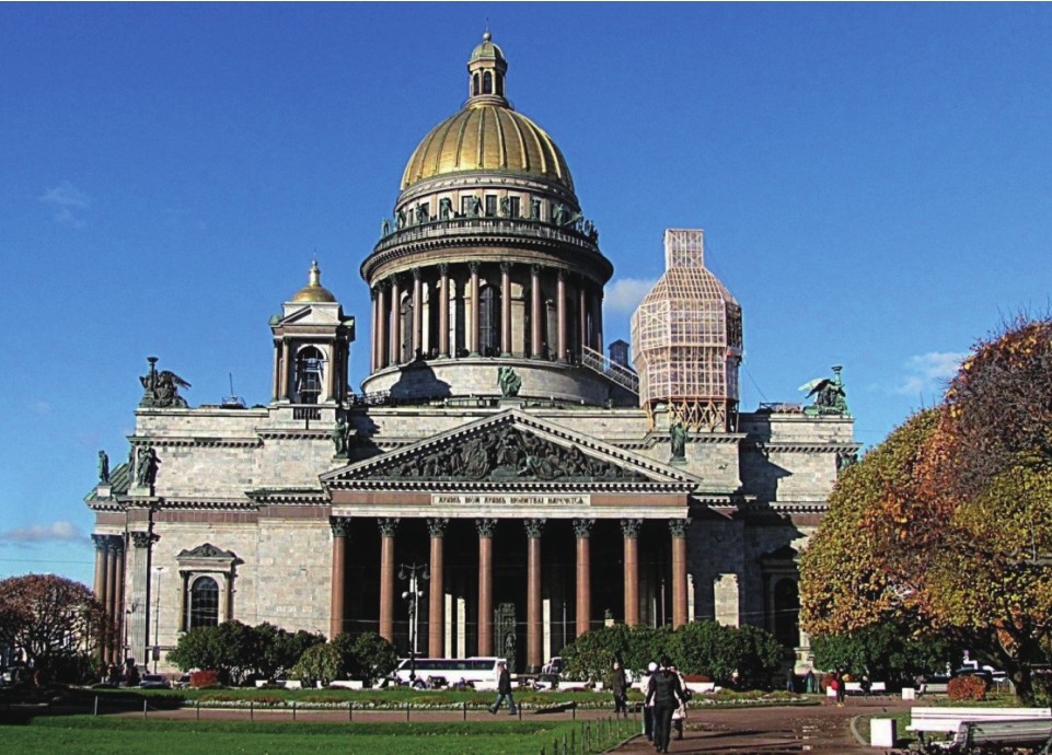 伊萨基大教堂(1818–1858,图1-34) 是俄罗斯最后一座古典主义风格的大型建筑,也是彼得堡规模最大的东正教教堂之一。这座教堂是为了纪念达尔玛茨克城的圣者伊萨基而建的,建筑设计师是奥古斯特·蒙费兰。