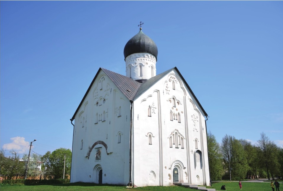 13–15世纪,诺夫哥罗德依然是古罗斯文化艺术发展的中心之一,也是大贵族、富商聚集的城市。该城的经济发展迅速,人们的生活水平较高。这些特征决定了其建筑艺术发展的独特的风格和倾向。 利普纳的尼古拉教堂(1292,图1-23) 是一座单圆顶三柱教堂,由大主教克里门特出资修建。这座教堂不同于12世纪下半叶在诺夫哥罗德流行的教堂建筑的外观。教堂正面不是由三个壁柱隔开,而是一个平面整体,半侧祭坛也由三个减到一个,传统的石灰墙皮变为石灰加石子的墙皮,这些都是传统的单圆顶三柱教堂所没有的。此外,建筑师还改变了传统的教堂建筑结构,没有使用拱状的屋顶结构。尼古拉教堂看上去敦实、坚固,体现出诺夫哥罗德的祭祀建筑的传统与创新的结合。像诺夫哥罗德郊外的卡瓦列夫的救主教堂(1345)、沃洛托夫田野上的安息教堂(1352)均是这种探索性结合的例子,表现出诺夫哥罗德的祭祀建筑发展的一种过渡风格。14世纪下半叶,诺夫哥罗德的圣约翰教堂(1384)、西蒙教堂(1368)等祭祀建筑多为单圆顶、四立柱教堂,其典型特征是外部装饰的考究:教堂正面墙上的壁槽里有绘画、三角形凹槽、浮雕十字架等装饰。诺夫哥罗德城里的费多尔·斯特拉基拉特教堂(1360–1361)、 伊里因大街上的主显圣容教堂(亦称救主教堂,1374,图1-24) 也是讲究外部装饰的祭祀建筑,显示出诺夫哥罗德建筑师的建筑理念和技术。