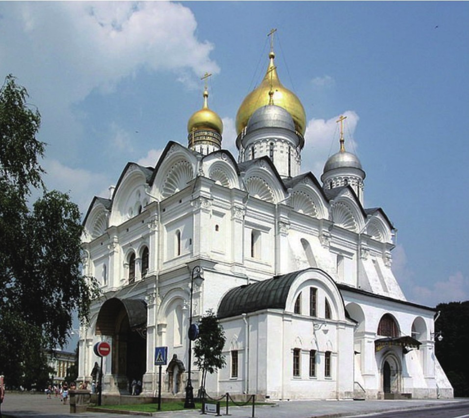 。伊凡·卡利达大公执政时期,曾在克里姆林宫内建造过一座天使长大教堂(1333),由于内部空间拥挤,教堂在16世纪初被拆掉了。1505年,伊凡三世下令建造新的天使长大教堂。新建的天使长大教堂高达21米,保留5圆顶、6立柱、5半圆形屋顶东正教教堂的外形和格局,用白石砌成,配有白石装饰。天使长大教堂在外观结构上与安息大教堂相仿,教堂正面也用壁柱纵向隔成几个间墙,同时还用一根横向的“腰带”隔为上下两部分,使教堂获得一种世俗建筑的样子。若去掉这座教堂顶部的圆弧顶,它简直就像一座世俗建筑物。
