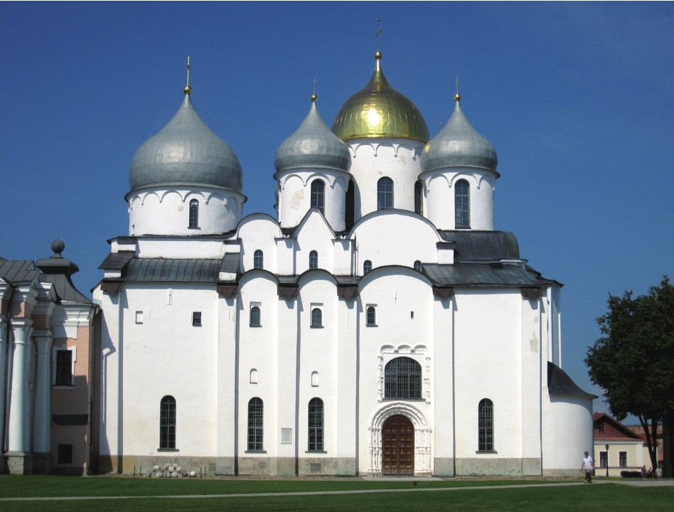 。这是古罗斯建筑艺术的又一个杰作。这座教堂的5个圆顶好像是由5个俄罗斯勇士组成的武士队,中间的勇士头戴金色头盔,他周围簇拥着4位头戴银色头盔的勇士,他们好像在一起开会……诺夫哥罗德索菲亚大教堂有露天走廊,内部有5个间堂,宽敞的楼台,还有登上楼台的塔梯。诺夫哥罗德索菲亚大教堂与基辅索菲亚大教堂有诸多不同:只有5个而不是13个圆顶,只有一排而不是两排走廊,只有一个而不是两个塔梯,教堂内的东部只有3个而不是5个半圆形的壁龛。此外,诺夫哥罗德索菲亚大教堂的长和宽都不及基辅索菲亚大教堂