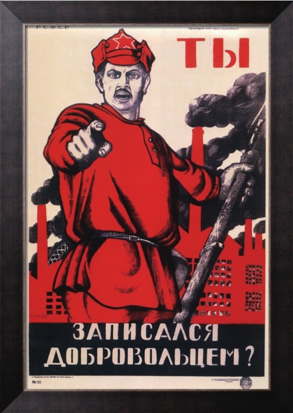在国内战争时期,在俄罗斯城镇的大街小巷,处处可以看到许多具有鲜明的政治内容和色彩的宣传画和招贴画 ,这种绘画体裁能对政治事件和社会变革做出及时的反应。Д. 莫尔、B. 德尼、А. 阿普西特、M. 切尔内赫等人是使用这种体裁绘画的画家。其中,Д. 莫尔创作的宣传画 《你报名参加志愿军了吗?》 (1920,图2-6) 传遍俄罗斯大地,激励许多青年人奔赴战场与白军作战,保卫新生的苏维埃政权。