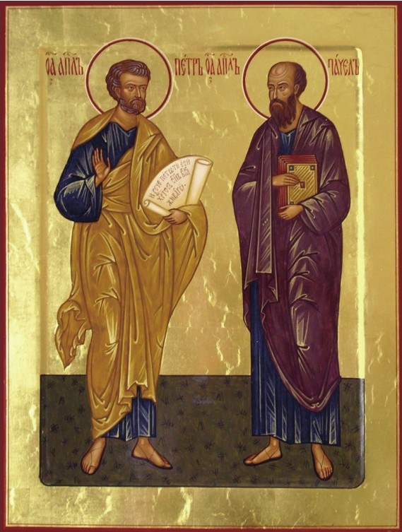 。彼得和保罗的头上均罩着灵光环,两人相对而立,形象魁梧、伟岸,目光平静、祥和。彼得的左手拿着羊皮纸,保罗双手捧着一本书,体现出这两位使徒的传道生涯。他们身披的皱褶画得逼真,衣服的蓝、黄、暗紫色的搭配柔和。这幅圣像画虽因年久失去昔日的面貌,但依然能表现出当时的圣像画家的绘画水平。