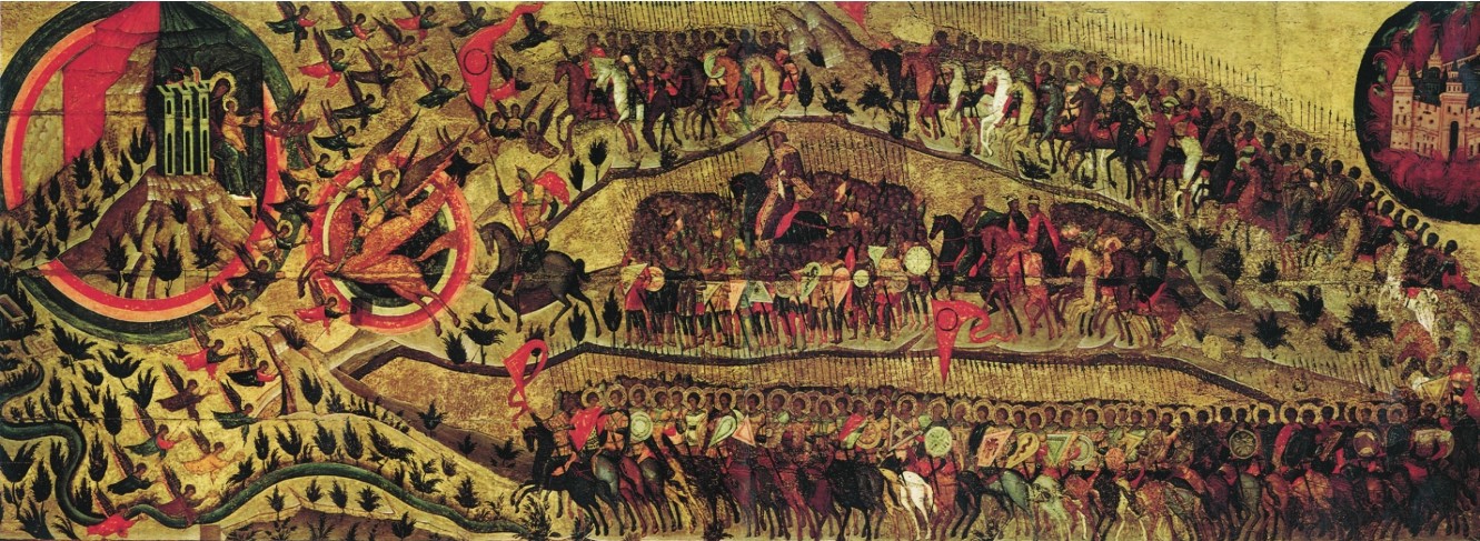 ),这幅画是为纪念喀山战役的胜利而作的。沙皇伊凡雷帝率领着“胜利大军”庄严威武地前进。天使长米迦勒是天兵之首,他乘着一匹带翼的骏马在前面领路。在浩浩荡荡的队伍中,有弗拉基米尔大公、他的儿子鲍利斯和格列勃、亚历山大·涅夫斯基、德米特利·顿斯科伊以及俄罗斯历史上的其他著名将领。拜占庭君主康斯坦丁手拿十字架站在画面中间,迎面飞来一些天使,圣母怀抱圣婴迎接这支部队。这幅画的寓意明确,强调东正教教会在俄罗斯历史上的作用,把俄罗斯多次的军事胜利阐释成为“天力”保护的结果,所以,俄罗斯将士要忠于东正教。