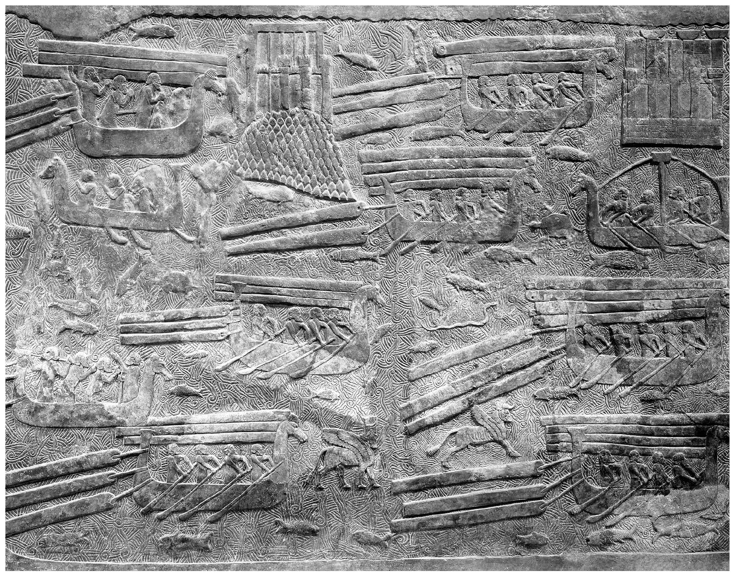 亚述宫殿中的一幅浮雕作品,描绘了腓尼基人用船只运送庞大的雪松木的场景,他们有时将其拖在船后,有时吊在船上。
