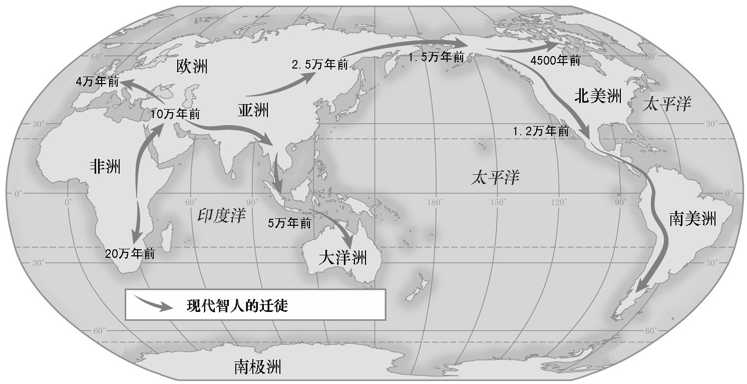直立人本来已遍及亚欧大陆各地,约在5万年前开始移民大洋洲,约2万年至1万年前进入美洲。由于混血和各区域地理条件差别造成的巨大影响,人类经遗传而造成肤色、毛发、鼻唇等也极不相同,终于形成黄、白、黑三大人种,即蒙古人种、欧罗巴人种和尼格罗人种。但这只是外貌特征的差异,各人种均可通婚,而且在体质和智力上并无优劣之分,这说明人种的划分是人类起源后,在迁徙过程中随着环境的变化逐步形成的。黄种人主要生活于亚洲大陆和美洲,白种人主要生活于欧洲大陆,黑种人起源于撒哈拉沙漠以南。今天,各人种混居现象越来越普遍,但其主要集中区域并没有改变。人类学和考古学的研究认为,人类的种族特征具有明显的“适应性意义”,或者说它们是为了适应环境的需要才形成的,但它们并未改变人类在体质和智力乃至基因上统一的和基本的特征,又反过来证明了人类起源的一元性。 尼格罗人种的典型特征,是颜色很深的皮肤、卷发、宽鼻,以及似乎外翻的厚唇,那是有效适应高度湿热环境的需要:黑色素可使皮肤免受灼热伤害,卷发像一条透气的通道可使头部免于过热,宽而大的鼻、表面黏膜分布面宽的厚唇以及身体表面大量的汗腺,均有助于热量的散发。而亚洲炎热干燥的大陆性气候、半荒漠和草原自然景观、干冷的大风和遮天蔽日的沙尘暴,令蒙古人种在体质结构上增添了许多防护性特点:面部的脂肪层比尼格罗人和欧罗巴人都要厚,且眼睛开缝都较窄,在内眼角还长有一种特别的皱褶,叫“内眥褶”。高耸的鼻子是欧罗巴人种最突出的体形特点,而那可能是为了适应第四纪末期欧洲严酷的气候条件的需要,以经受住严寒的折磨,因为特别前突的鼻管延长了空气由鼻腔外到呼吸道的距离,使空气变得较为暖和。