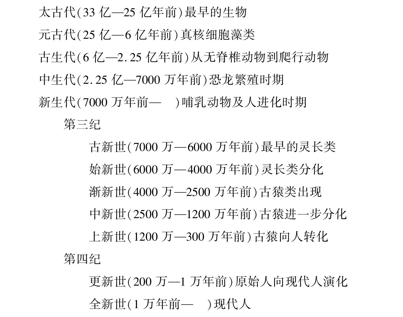 按生物分类学,整个生物界可分为:界、门、纲、目、科、属、种。人类作为智人种,归人属、人科、灵长目,而灵长目又归于哺乳纲、脊椎动物门、动物界。科学研究表明,地球存在的历史,如果从地壳的形成算起,至少在46亿年以上;而生物存在的历史,若从原核细胞菌类化石算起,只不过33亿年左右;至于人类存在的历史,只是最近1000万年左右的事情,在生物史中只占3‰左右。为了确定生物与地质变化的关系,地质学家提出了“纪”(period)的概念,把有生物化石发现的地质时期划分为四个纪:第一纪起始于5亿年前,称为鱼类时代;第二纪起始于2.25亿年前,称为爬行动物时代;第三纪起始于7000万年前,称为哺乳动物时代;第四纪起始于200万年前,这时才有人类化石的存在。在第一纪之前未发现生物化石,有人称之为“无生纪”,但无化石存在不等于不曾有过生命,因菌类生物难于以化石的形式存在,因此这一提法并不正确。所以,为了说明人类的起源及其在自然界中的地位,有必要引入两大系统性概念:一是地质年代判断法,二是生物分类学,以便最终确定人在生物谱系及自然界中的位置。于是,关于人类起源、生物进化与自然演变,就形成了这样一种关系,可列表如下: