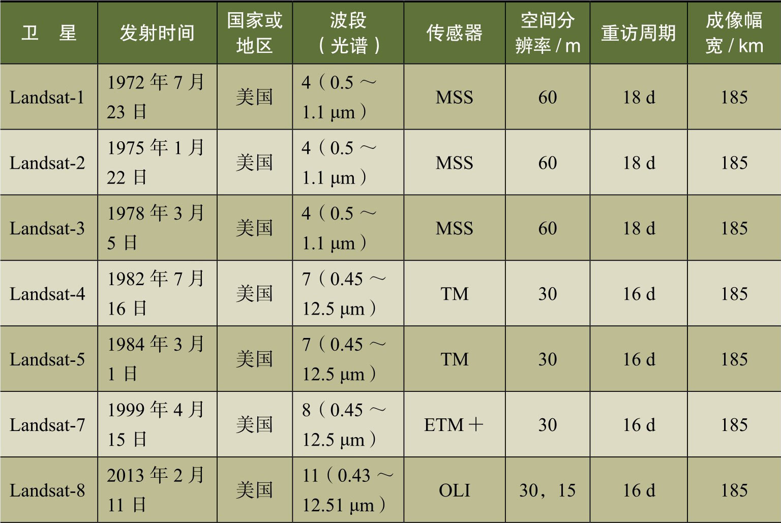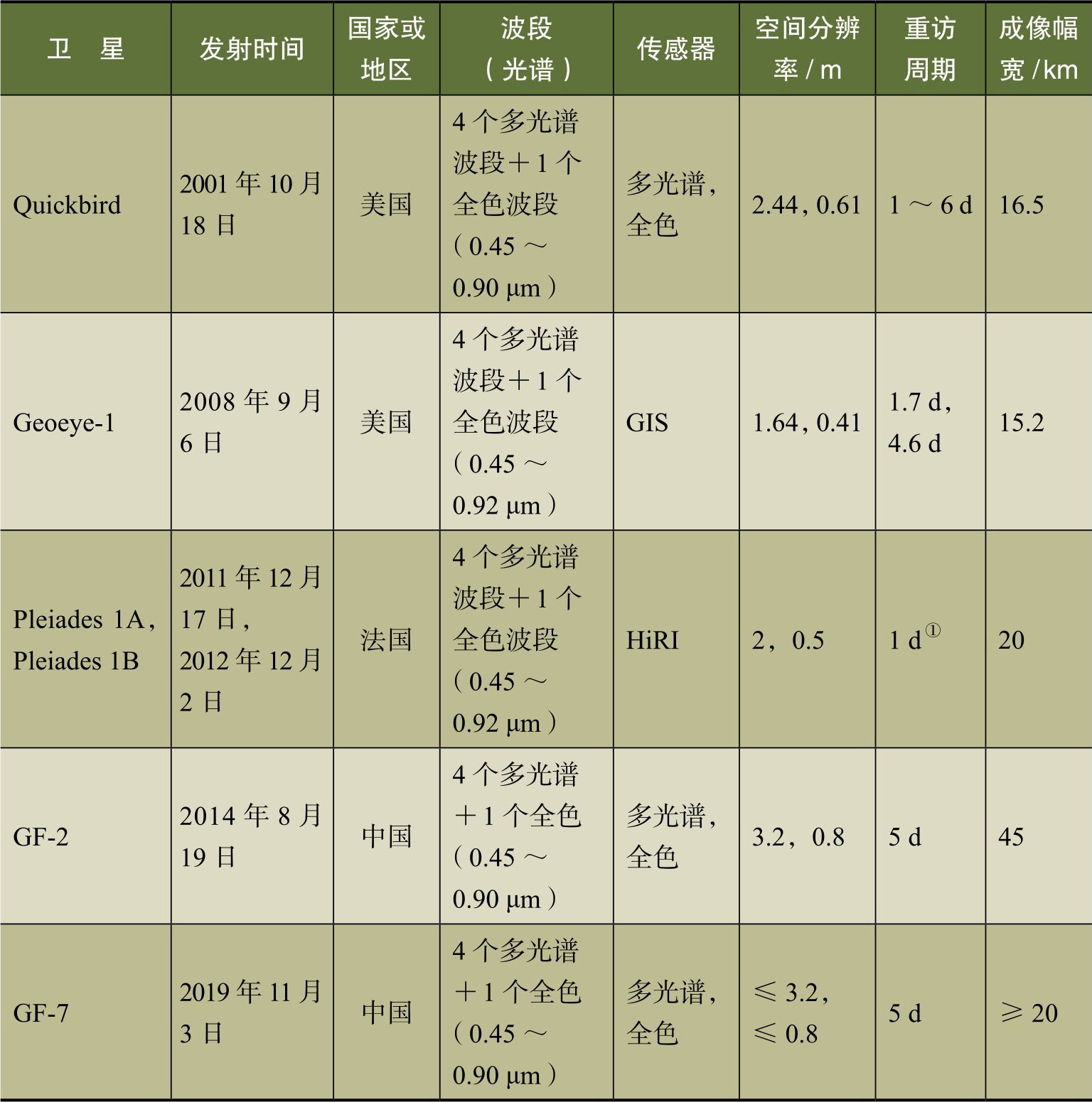 表3-1 中等分辨率遥感卫星技术指标