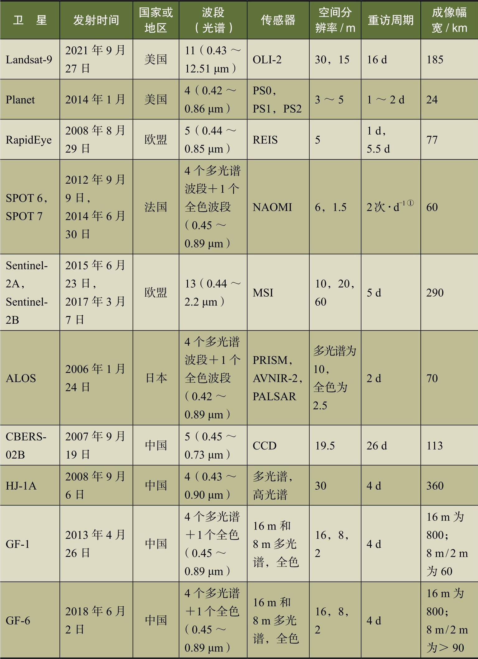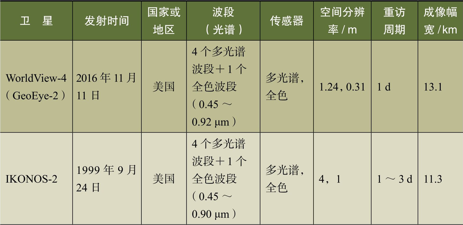 目前,遥感卫星数量、类型众多。根据遥感观测的对象,主要分为对地遥感卫星、月球遥感卫星以及行星遥感卫星。其中,根据对地观测的领域,可以将对地遥感卫星分为陆地、大气和海洋三大系列。本节主要介绍面向村镇社区尺度对地观测的国内、国外中高分辨率遥感卫星。