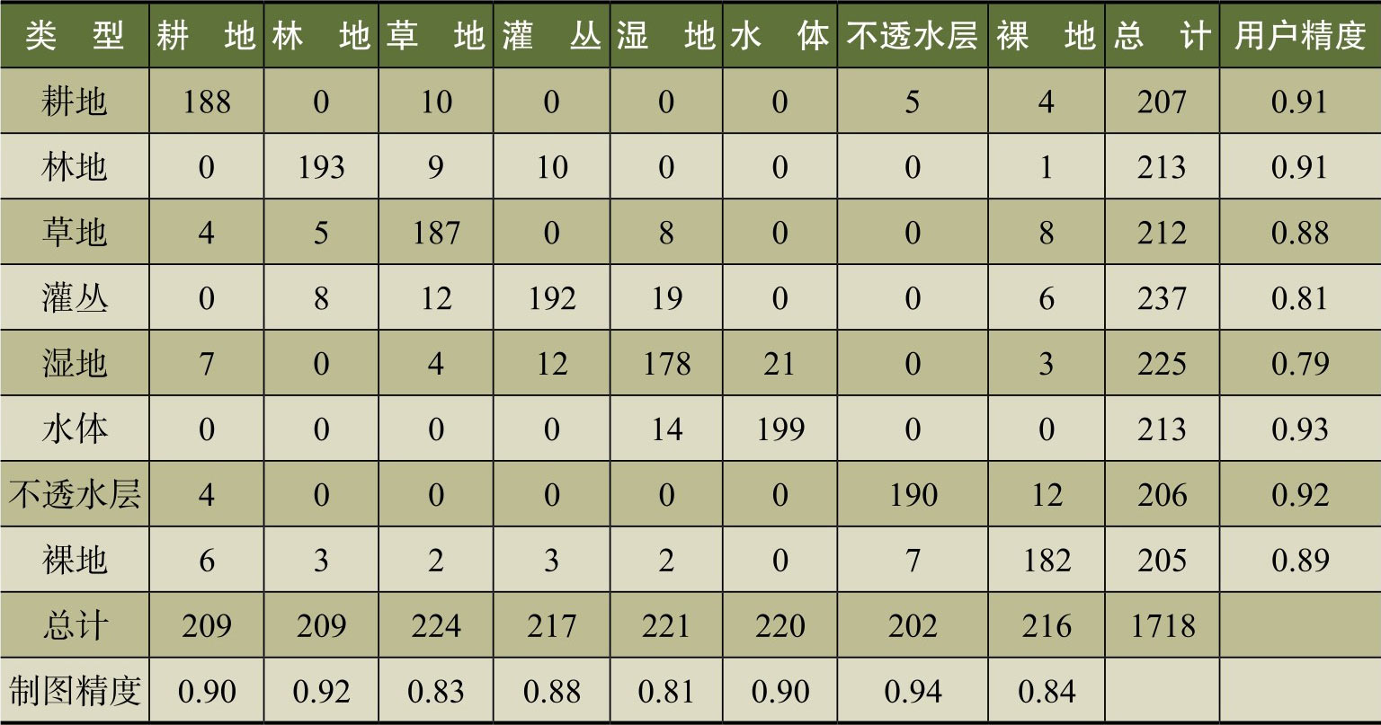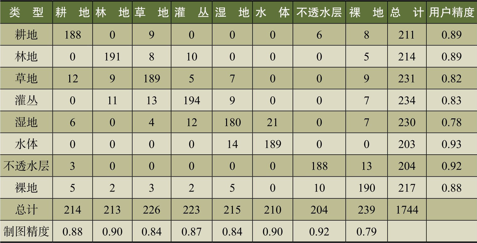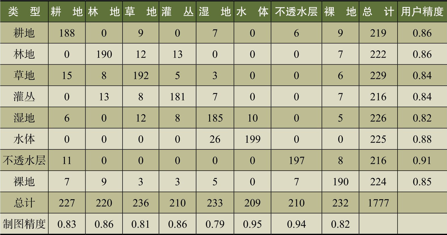 表4-2 2016年永定河流域土地覆被分类混淆矩阵