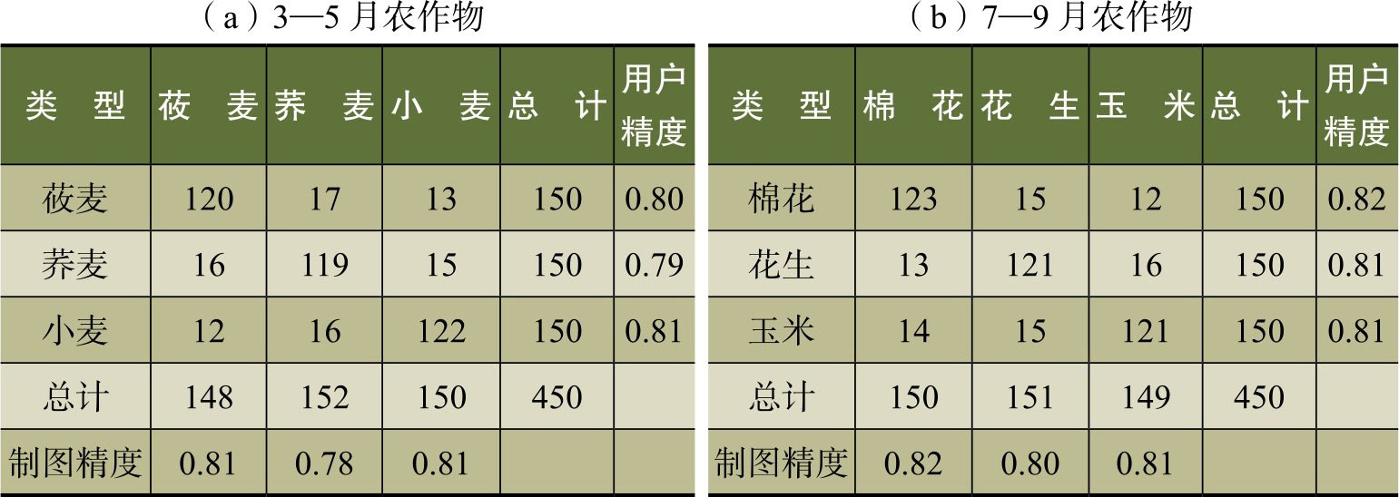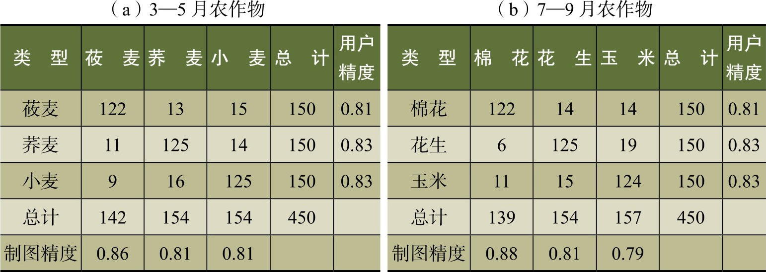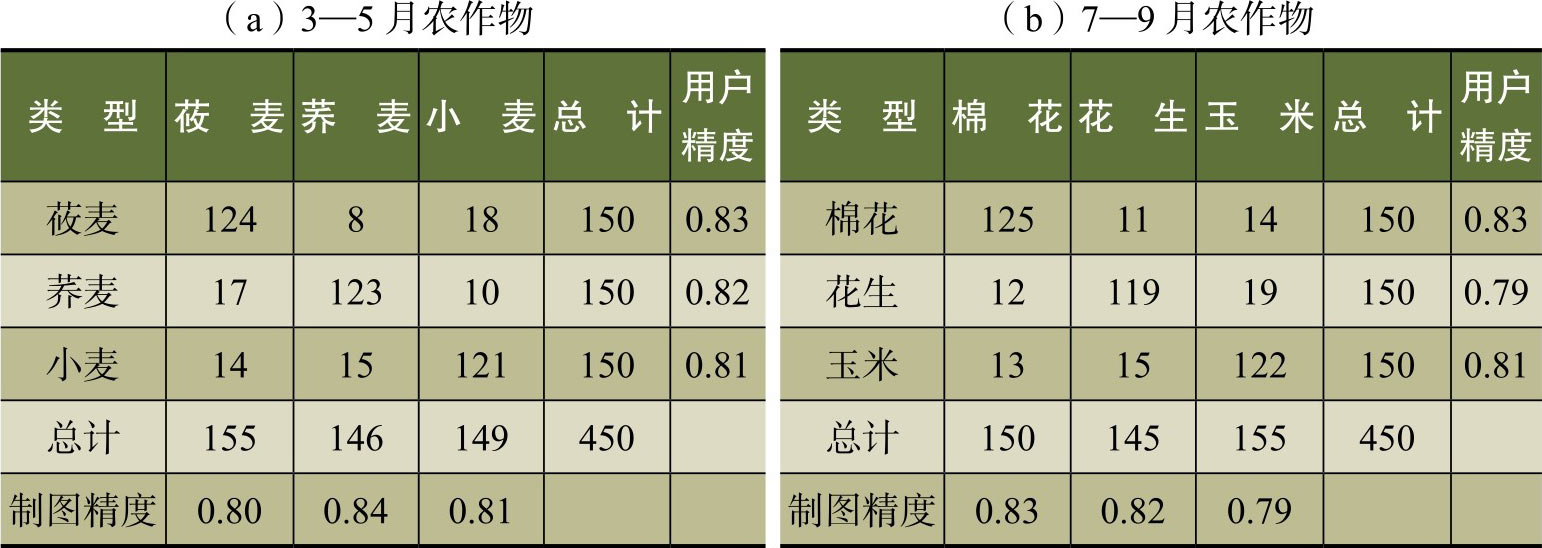 为保证精度验证结果的准确性,在野外调查和实地验证时,每种类型采集至少150个样点,用以验证和完善土地覆被分类提取结果,从而保障最终的产品质量;采用Google Earth平台的高分辨率遥感影像进行验证;将检验人员划分为3个精度检验小组,进行多轮检查和交互验证。经统计,2014年、2016年和2019年3-5月农作物种植结构分类总精度分别为80.22%、82.67%和81.78%。2014年、2016年和2019年的7-9月农作物种植结构分类总精度分别为81.11%、82.44%和81.33%。各年度农作物种植结构分类混淆矩阵见表4-4至表4-6。