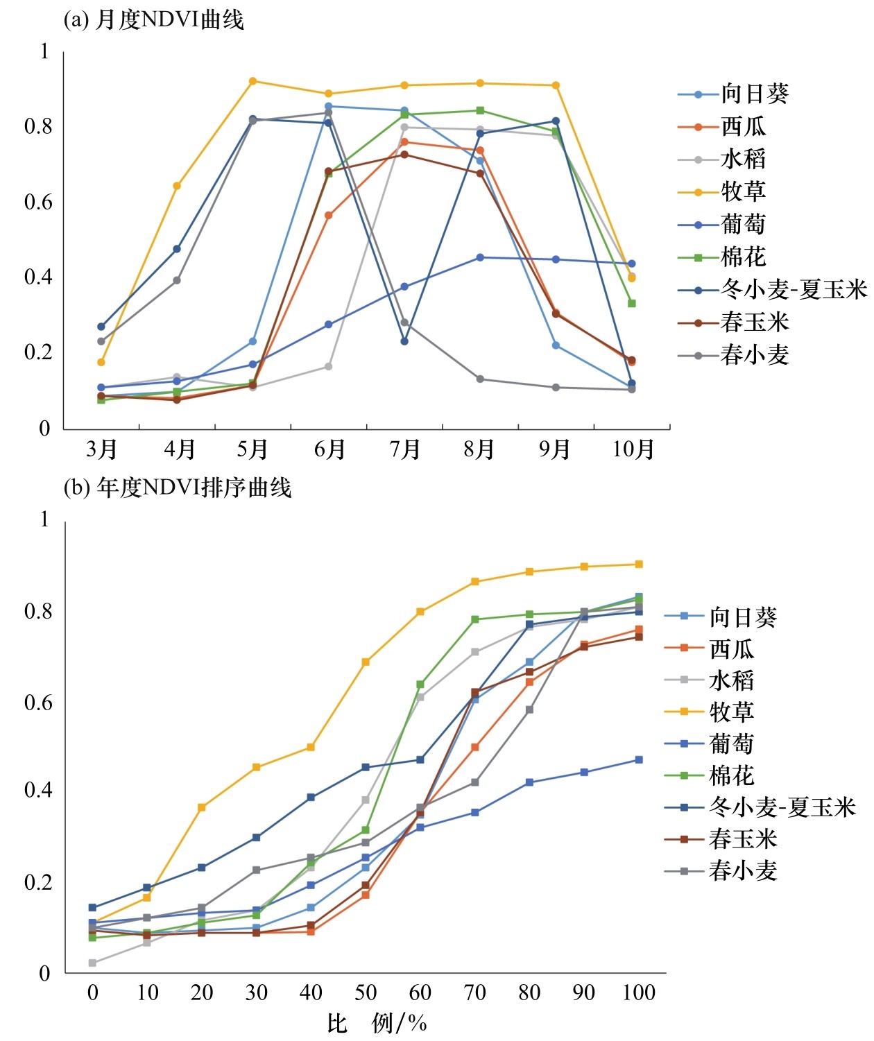 图4-1 不同地物的月度NDVI曲线与年度NDVI排序曲线的对比