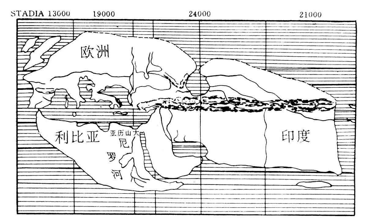 埃拉托色尼是杰出的地理学家,是他将希腊语中的“Geograph-ica”定名为“地理学”,他根据埃及在一条子午线上两地于夏至日太阳阴影长度的比值,算出地球圆周长约为39360km。此数据与地球实际周长十分接近。其次他接受前人关于欧、亚、非三洲分为五个温度带之说,给出数理界限,并在已知的世界地图上加上七条经度、七条纬度,他开创了用经纬度的科学方法制图之先声,如图1-1所示。
