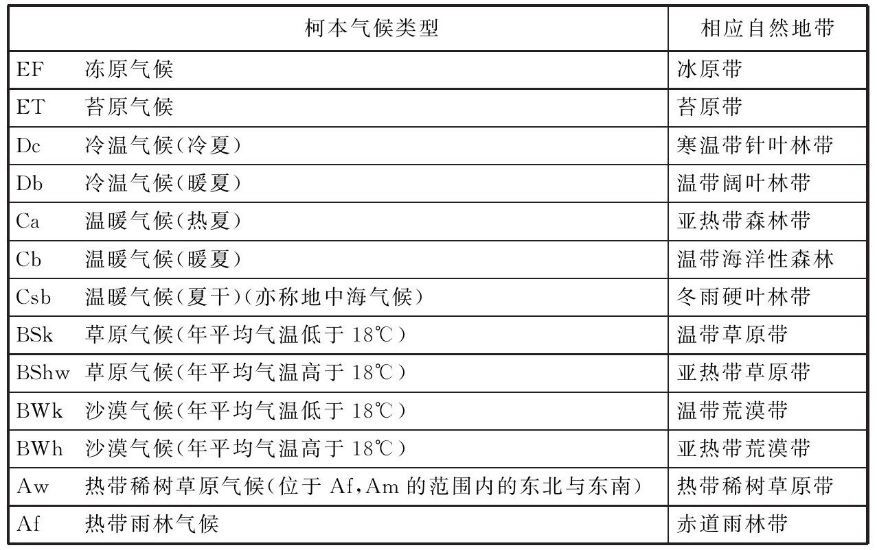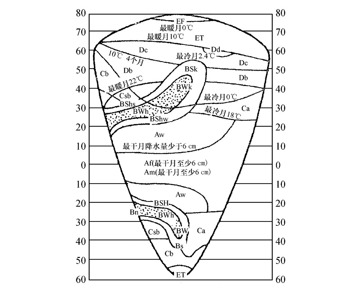 它是研究气候的特征、形成、分布和演变的学科。各种仪器的发明,提供了准确的与可以比较的量化数据,加上气象学的发展,使人们对气候的形成原因有了深入的了解。广大区域与全球的观测数据的汇集出现了全球的等温线图。在20世纪初,德国学者柯本根据气候同植物的关系,对世界的气候进行了分类并于1936年作出假想大陆气候示意图(见图1-2)。它使人们可以从全球规模上去认识地球表面气候类型分布的规律性现象。