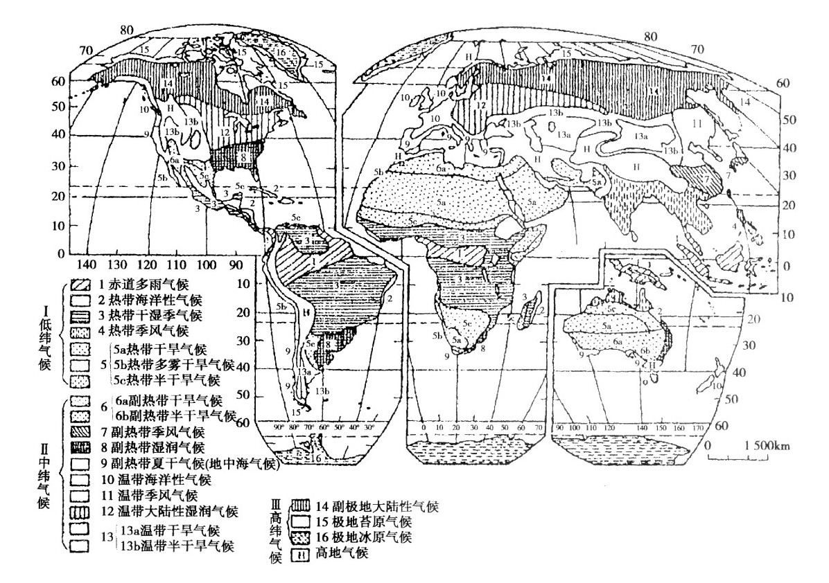 根据气温与降水这两个主要特点的分布与组合,可以将世界气候分成三个气候带,十六个气候类型(图2-7)。