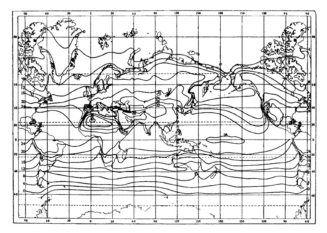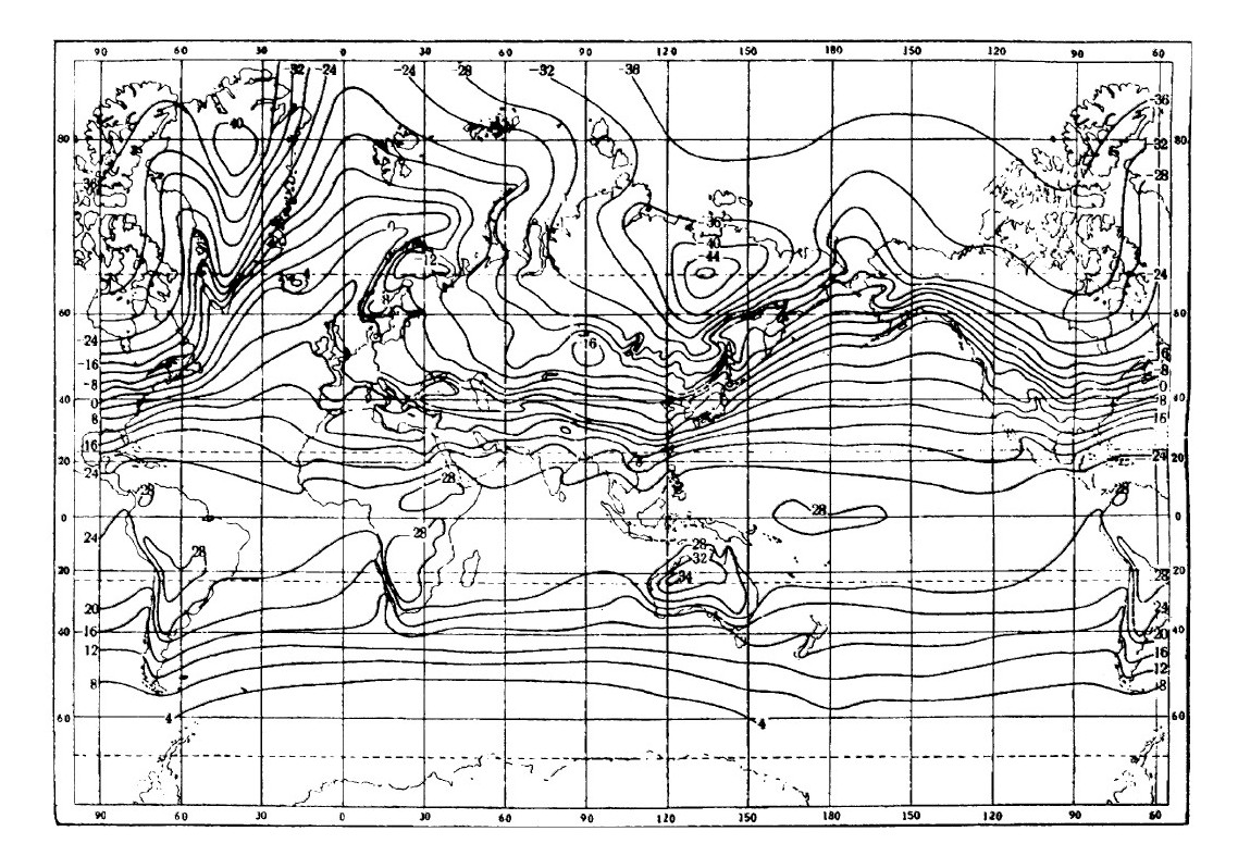 气温的水平分布通常用等温线表示。为消除海拔影响,可将地面气温实际观测值订正为海平面温度,然后绘制等温线。从世界1月(图2-1)、7月(图2-2)平均气温分布图不仅反映太阳辐射在地表的分布情况,也表示地球表面的陆海、地形、洋流等热力分布的影响。根据世界气温度分布图,可以看出其特点如下: