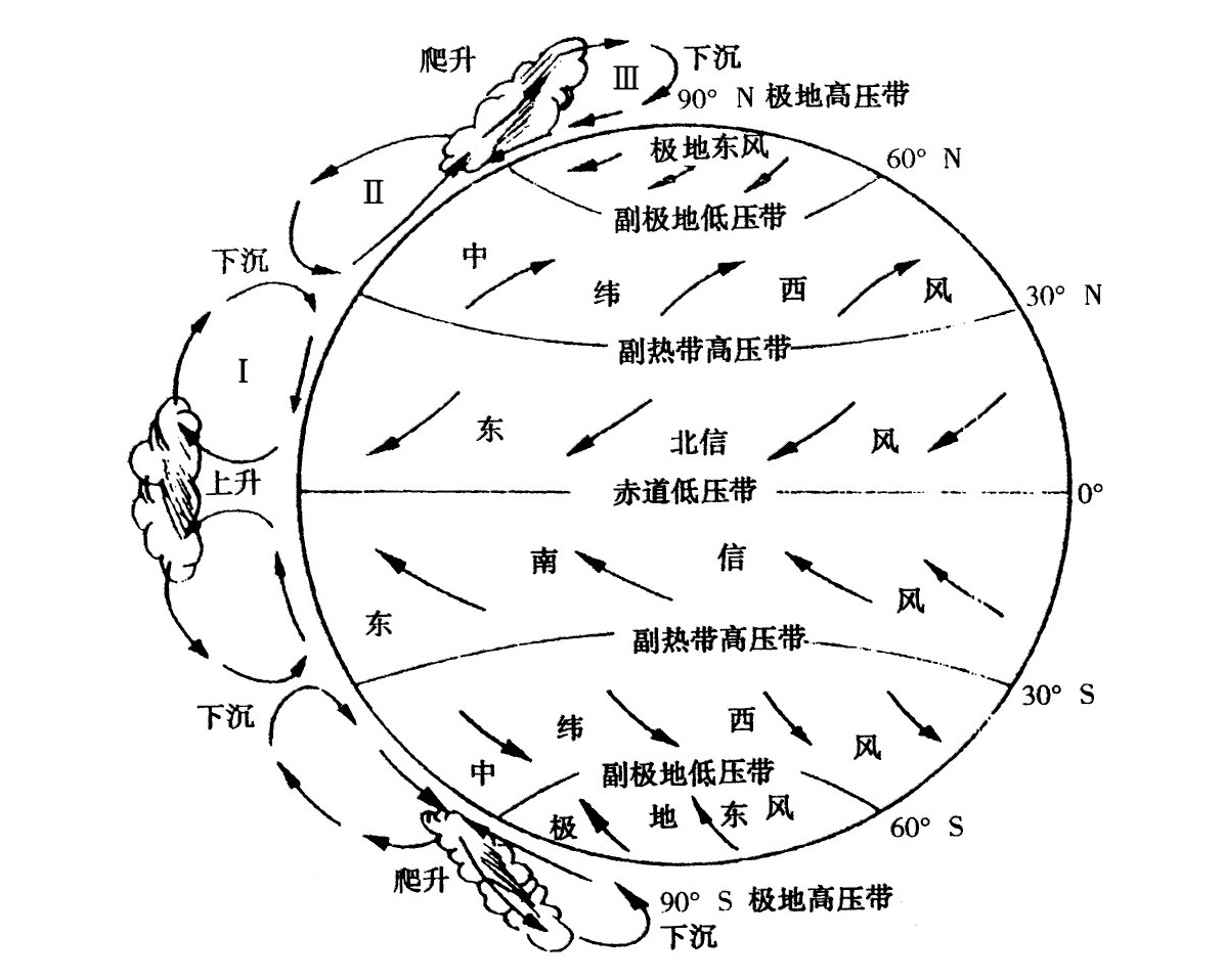 大气环流所造成的七个气压带导致行星风系中三个盛行风带(图2-3)。