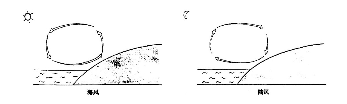 1.海陆风 在滨海地区,白天陆地增温比海面快,陆面气温高于海面,因而下层风由海面吹向陆地,上层风则相反,为由陆地吹向海洋。到夜间,陆地降温快,海面降温慢,海面气温高于陆面,故风向由地面吹向海洋,上层风则由海洋吹向陆地。从地面看,白天是海风,夜晚是陆风。在海边地区,白天海风去暑,夜晚陆风降温,使人感到舒适(图2-4)。