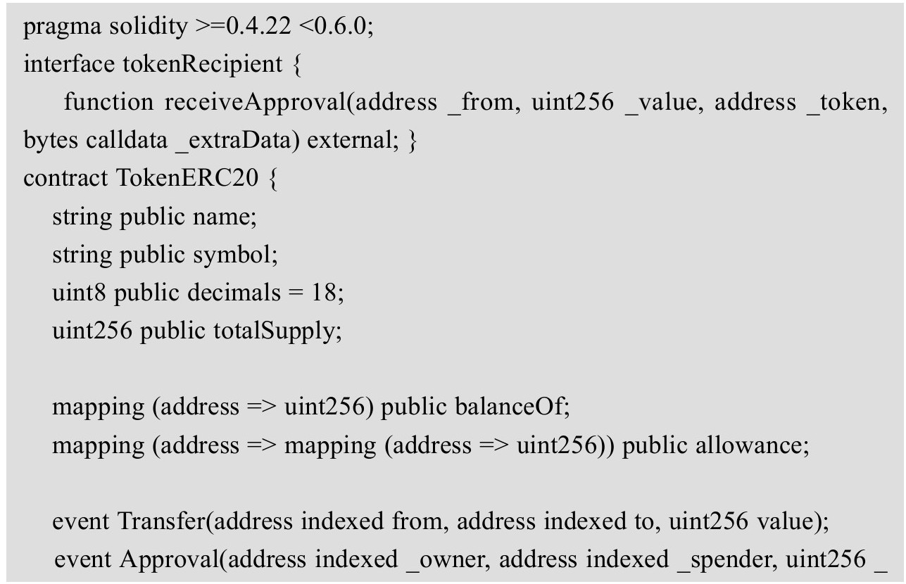 如何发行自己的货币呢?我们以以太坊协议为例进行介绍。在以太坊上有多种发行Token的协议,这里我们基于ERC20协议发行一款代币。这个智能合约的代码如下。