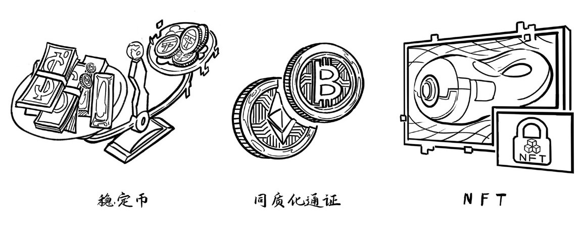 非同质化通证(Non-Fungible Token, NFT):有点类似现实世界的不动产、古玩、收藏品等。它是唯一的、不可拆分的,即世界上不会有两个完全相同的NFT。NFT的这种唯一所属的特性使其成为在数字世界标记原生数字资产所有权的好方法。NFT可以代表如画作、音频、视频、游戏中的项目和其他形式的创意作品。收藏者购买NFT可以获得作品的所有权证明,而艺术家也可以利用NFT创造出独一无二的数字艺术品。