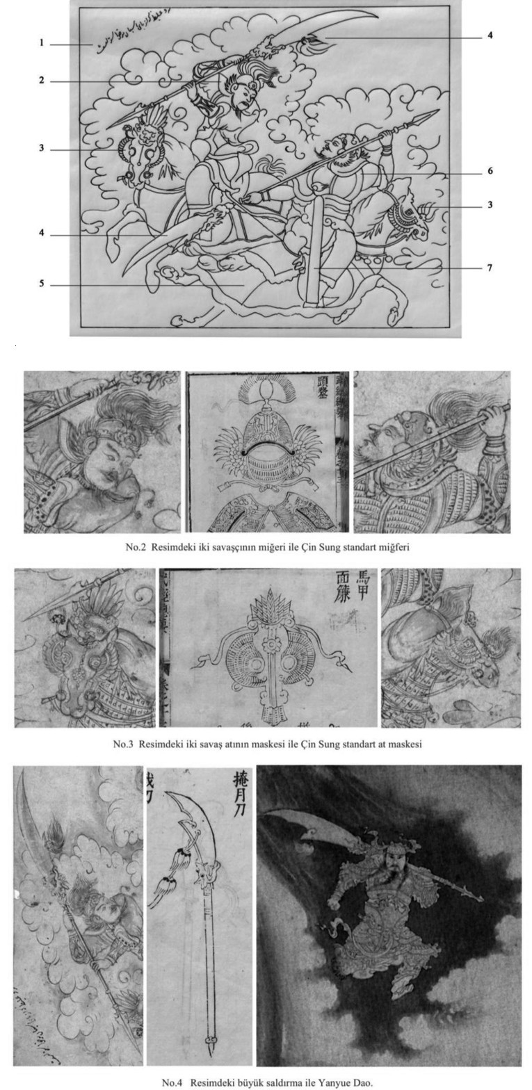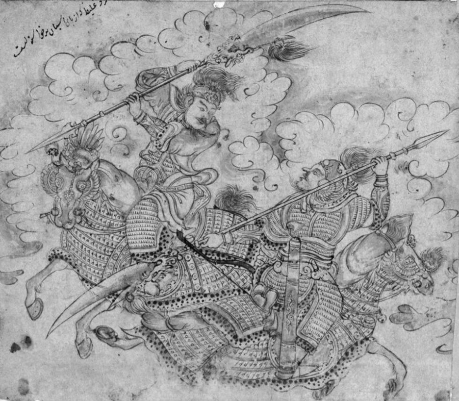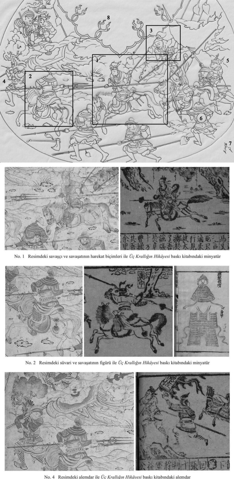 由此笔者认为:一,这幅册页藏刀马人物画的主题为《三国志》中赵云长坂坡之战;二,此作品的右下角虽然写有“黑笔之作( Kâr-ı Muhammed Siyah Kalem) ”的签名,但与通常意义上的穆罕默德·黑笔风格差异较大,不排除后人后加上的款识;三,这幅刀马人物画所临摹的原型可能不限于某一幅具体的中国绘画作品,而有可能是波斯画师对《三国志》插图画和瓷器画等多种形式的艺术作品的整合;四,作品可能出自14世纪末至15世纪初的波斯宫廷画师之手。